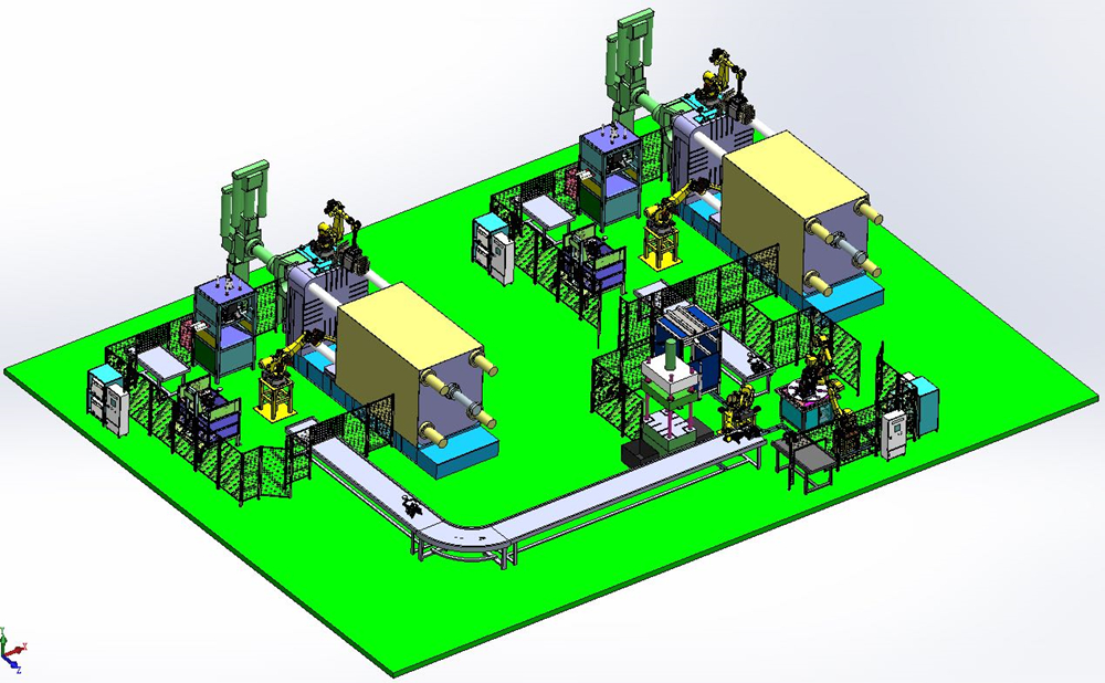 廣東德琺麒開發的雙聯壓鑄島效果圖 蒲昌月先生介紹說:“雙聯壓鑄島是目前國內在運行的屈指可數的智能自動化壓鑄生產線,代表國內在該領域最高的技術水平。項目融入德琺麒12項專利技術,包括兩項發明專利,攻克了多項關鍵技術。”據介紹,這些關鍵技術包括壓鑄成型機理及工藝建模與分析,壓鑄島運行過程的模擬仿真技術、多種柔性生產技術,機器人與輔助設備的協同技術,工裝夾具研制及預制技術,以及中央集成、實時監控、遠程控制等軟件系統的研究開發。