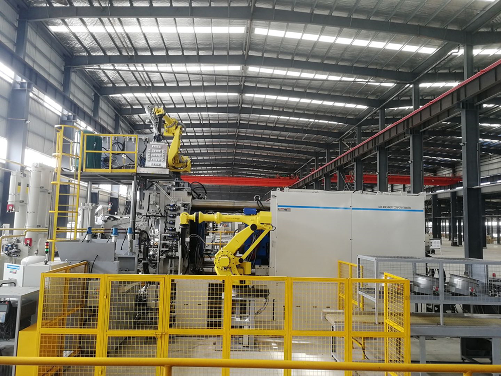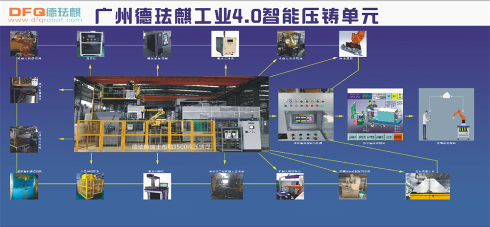 廣東德琺麒開發的雙聯壓鑄島 據介紹,廣州德琺麒開發的雙聯壓鑄島,由兩臺2500噸宇部冷室壓鑄機、7臺發那科機器人,配搭定量給湯、鑄件取出、仿形噴霧、去渣包、刻標、鋸料柄、精沖、打毛刺等輔助設備,開發并運用中央集成、實時監控、遠程監控等軟件系統,組成一個雙壓鑄主機的柔性壓鑄島,完成壓鑄生產全工序過程智能自動化。該壓鑄島主要生產福特汽車發動機缸體,生產線通過模塊切換,還可以生產減震塔等其他部件。