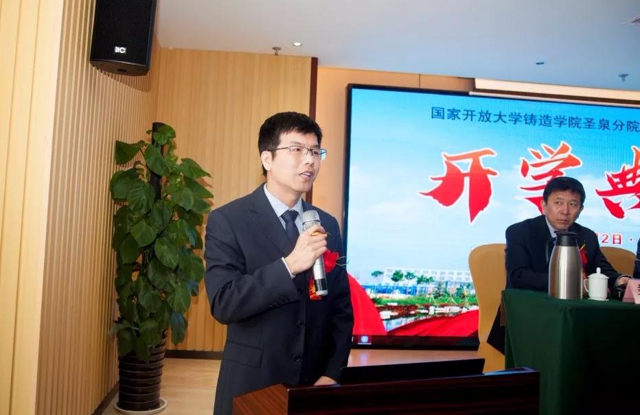 國家開放大學教務部部長葉志宏講話 圣泉集團唐地源總裁在致辭中講到,網絡教育是一個全新的教育模式,讓學員可以擺脫時間、地理位置的束縛,并可以接觸到行業最優質的資源。雖然圣泉分院今年是第一年招生,沒有辦學經驗,但是我們會充分利用好資源,為學員提供良好的學習條件,同時聘請優秀的高校教師和行業豐富經驗的高級工程師作為輔導老師,保證教學質量。最后,唐地源總裁表示,一定要把圣泉分院辦成鑄造學院系統的標桿單位。