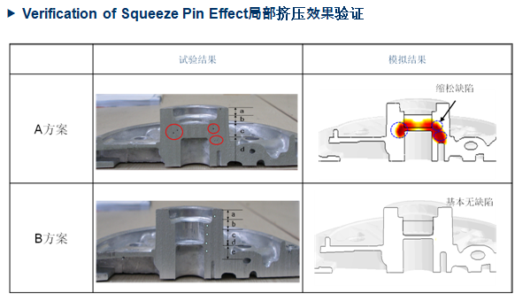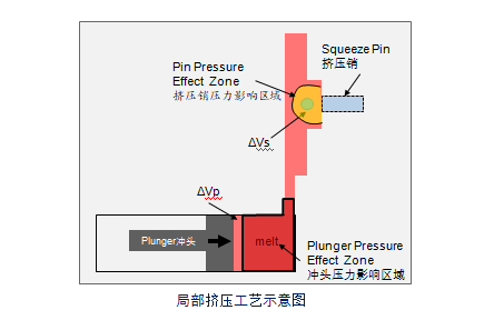 全新功能:局部擠壓縮松 隨著壓鑄件集成化程度越來越高,壓鑄產(chǎn)品也越來越復(fù)雜,壓鑄工藝不再局限于生產(chǎn)壁厚均勻的產(chǎn)品。圖示鑄件厚大位置區(qū)域,沖頭壓力不能有效傳遞到該位置,所以需要增設(shè)局部擠壓銷來解決該位置可能存在的縮松問題。其中黃色區(qū)域?yàn)樵摂D壓銷的影響區(qū)域。AnyCastingV6.6版本中的局部擠壓功能能夠綜合考慮擠壓銷壓力,擠壓銷運(yùn)動(dòng)速度,擠壓延遲時(shí)間、擠壓銷作用時(shí)間等因素來綜合判定局部擠壓對(duì)鑄件厚大位置縮松缺陷的影響。