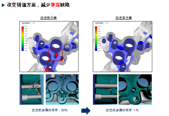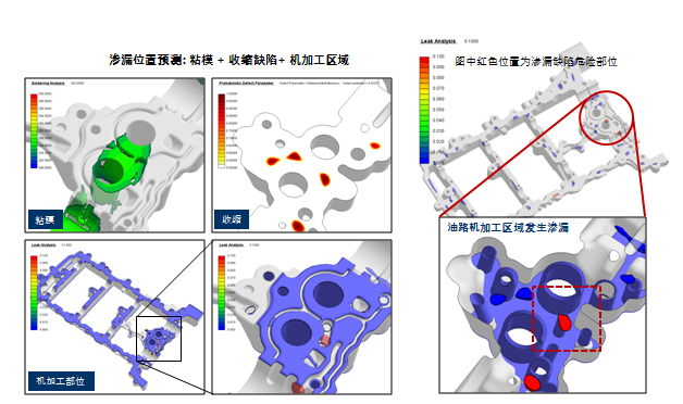 滲漏功能預(yù)測試壓泄露 滲漏缺陷作為鑄造生產(chǎn)中常見缺陷之一,廣受鑄造從業(yè)者的重視。所謂滲漏缺陷是指鑄件在壓力試驗(yàn)(水壓或氣壓)中出現(xiàn)泄露現(xiàn)象。AnyCastingV6.6版本的滲漏模塊可通過綜合考慮鑄件粘膜位置、機(jī)加位置以及縮松體積等參數(shù),精確預(yù)測鑄件試壓過程中可能存在的滲漏缺陷。