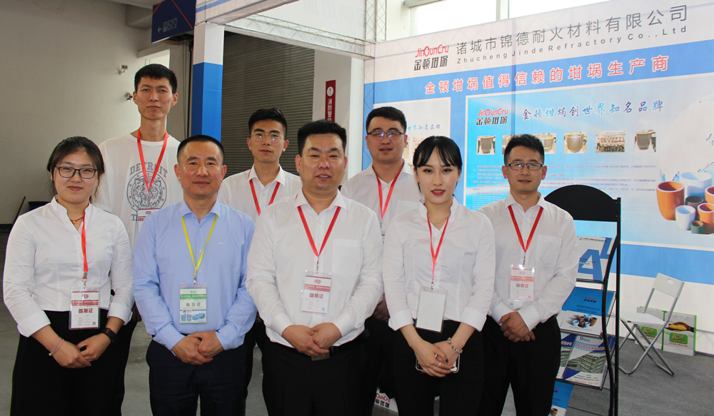 宜興錦楨研制的陶瓷湯勺具 值得一提的是,宜興錦楨研制的陶瓷湯勺具有較高的熔點,高度(1860±10)℃,較低的熱膨脹系統并具有優良的抗震性。該湯勺可應用于鋁、鎂、鋅、銅等金屬液的取湯。 金頓坩堝:推介完整的碳化硅石墨坩堝產品線 諸城市錦德耐火材料有限公司(“金頓坩堝”)攜兩款碳化硅石墨坩堝參展,包括:帶嘴坩堝1800#,口徑為780mm、高度900mm;U型坩堝950#,長837 mm、寬547 mm、高540mm。與此同時,金頓坩堝還推介其B型普通坩堝、直體感應坩堝等,其種類豐富、型號齊全的石墨坩堝產品,以彰顯其為用戶提供多樣化、全方位的熔煉材料解決方案的能力。