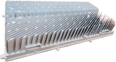 鋁合金半固態流變壓鑄件:散熱腔體大尺寸:903×445mm,高導熱率,導熱系數175W/m.k (常規壓鑄130W/m.K),壓鑄散熱片:100mm高,齒頂1.0mm,單邊拔模斜度0.8°。 通訊基站濾波器組件