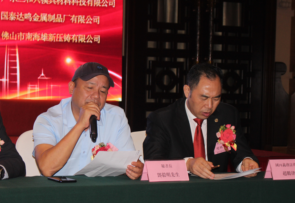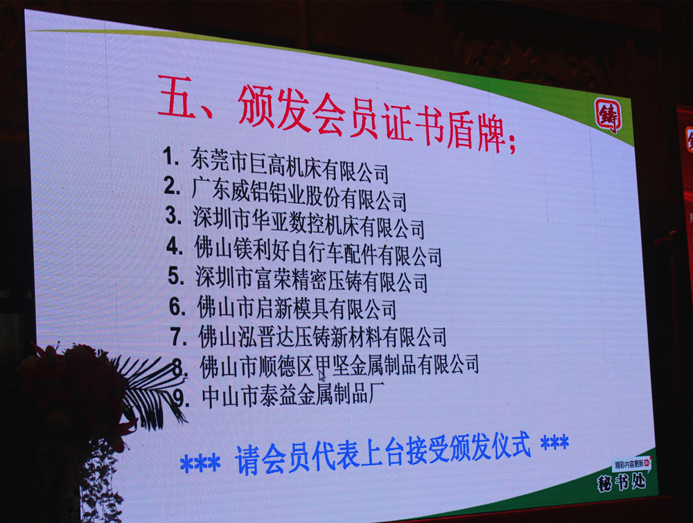 為會員企業頒發會員盾牌 會上,蔡子芳會長為東莞市巨高機床有限公司、廣東威鋁鋁業股份有限公司、深圳市華亞數控機床有限公司、佛山鎂利好自行車配件有限公司、深圳市富榮精密壓鑄有限公司、佛山市啟新模具有限公司、佛山市泓晉達壓鑄新材料有限公司、佛山市順德區甲堅金屬制品有限公司、中山市泰益金屬制品廠等9家會員企業代表一一頒發會員盾牌,并合影留念。