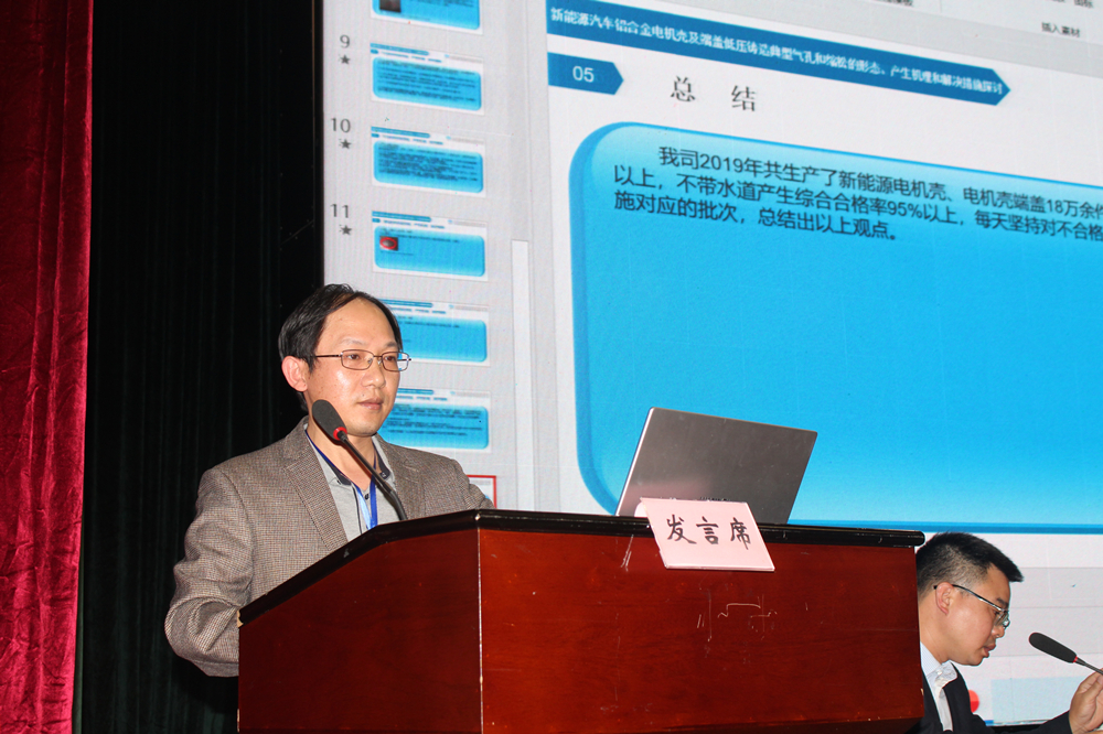 重慶志成機(jī)械有限公司朱志紅先生以《新能源汽車鋁合金電機(jī)殼及端蓋低壓鑄造典型氣孔和縮孔的形態(tài)、產(chǎn)生機(jī)理和解 決措施探討》為題作報(bào)告