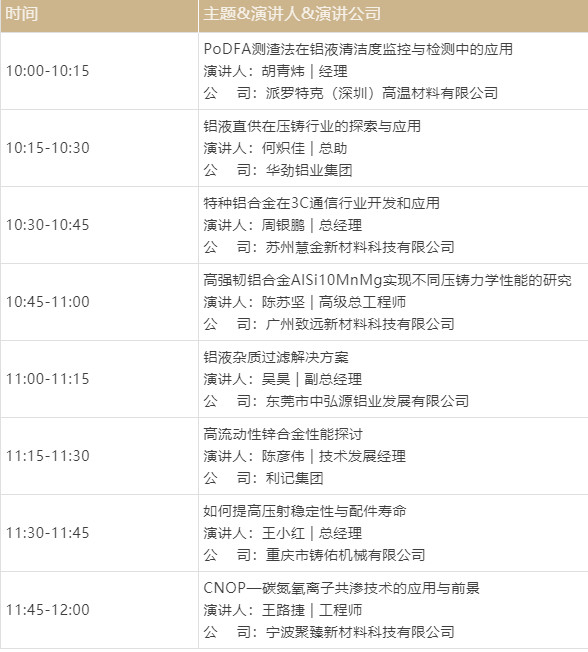 第3屆東莞壓鑄節 2019年中鑄科技主辦了壓鑄人自己的節日首屆“東莞壓鑄節”,并取得了圓滿成功。之后的2020年的第2屆“東莞壓鑄節”雖有疫情影響,但仍然更上一層樓。今年我們將繼續迎來第3屆“東莞壓鑄節”,活動更加豐富,規模更大! 2021年12月10日-12日,通過3天的時間,壓鑄節上將進行5場壓鑄技術分享,特邀了44家企業進行主題分享,從輔料耗材、模具、設備、后處理、檢測五大方面入手,多角度讓每位參加的壓鑄同仁學到知識,得到技術。 壓鑄原輔料耗材應用技術研討會 12月10日上午10:00-12:00 本研討會主題涉及壓鑄合金、脫模劑、沖頭等原料耗材。其最新的研究應用均在此研討會范圍,如高導熱鋁合金、耐高溫脫模劑、長壽命沖頭等。