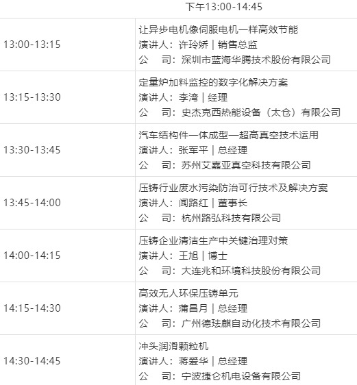 先進壓鑄設備技術研討會 12月11日上午10:00-11:30 下午13:00-14:45 本研討會主題涉及壓鑄機、定量熔爐、自動化、環保等。其最新的研究應用均在此研討會范圍,如超大型壓鑄機、高性能壓鑄機、多滑塊壓鑄機、伺服電機、超高真空技術、環保等。