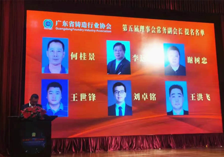 在第十二次會員大會會議上,奚志偉先生、李明端先生被大會推選為名譽顧問,沐清潞先生、何韶先生、唐杰雄先生、陳永成先生被大會推選為名譽會長。第五屆一次理事會上,審議通過表決,廣東揚山聯合精密制造股份有限公司董事長何桂景、嘉瑞科技(惠州)有限公司主席李遠發、廣東省鑄力鑄材科技有限公司董事長兼總經理謝樹忠、廣東新興鑄管有限公司 總經理王世鋒、力勁集團深圳領威科技有限公司集團行政總裁劉卓銘、佛山市雄新壓鑄有限公司總經理王洪飛當選為第五屆理事會常務副會長;張康林先生被聘任為協會秘書長,張國光先生當選為協會常務秘書長,趙海東先生、劉啟平先生分別當選為協會專家委員會主任及副主任。