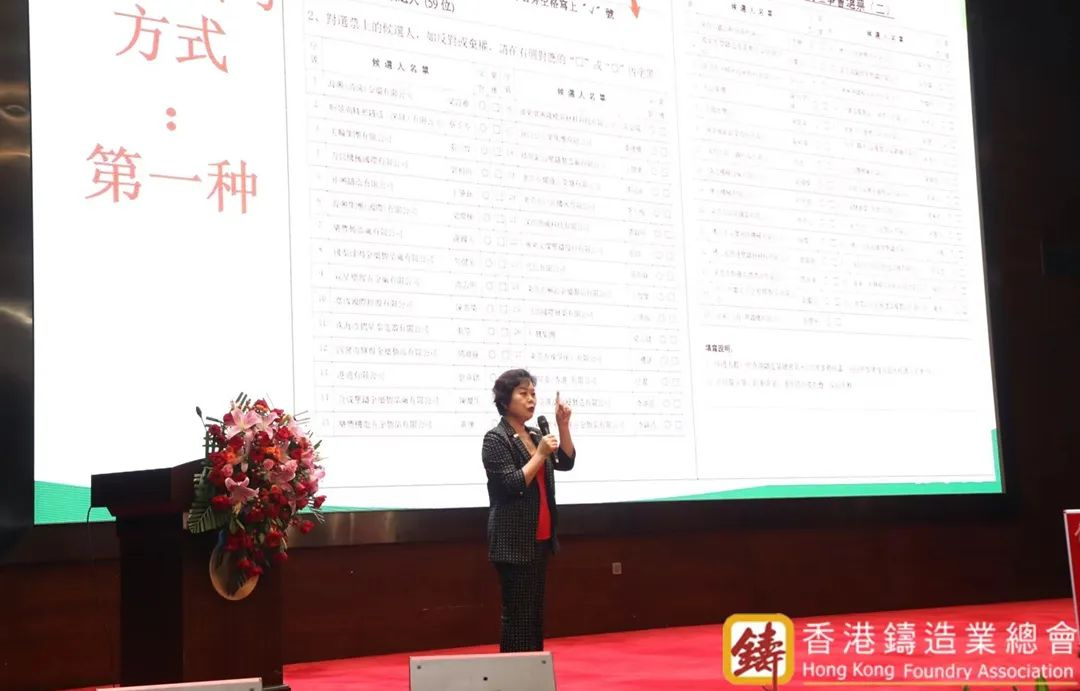香港鑄造業總會常務副秘書長張沛女士擔任大會主持 會員頒牌環節禮畢,大會進入最重要的環節——會員企業代表投票參與總會會務工作。投票開始前,義務法律顧問趙鵬律師報告了有權投票人數及授權書數量。緊接著正式進入投票環節,各會員單位代表們投下自己莊嚴的一票,選出自己信賴的人選。
