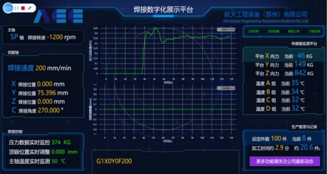▲銑削加工 該裝備搭載了全新一代探測通訊系統以及自主研發的熱管理系統,在進行固相加工過程中,實時高頻監測焊接過程的扭矩、壓力等數值,結合高清攝影頭對焊接形貌的實時分析,經過系統運算并結合加工工藝庫記錄參數進行分析,對加工參數調整和熱量管理系統介入時機進行判斷并做出響應,實現了制造的閉環控制,有效保障了構件成品質量,提高了生產效率。