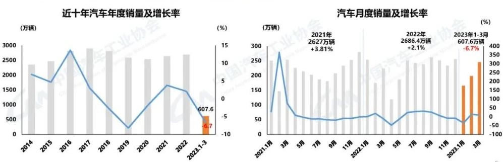 ![]() 近日(4月10日),中國汽車工業協會(簡稱“中汽協”)發布3月汽車行業經濟情況。2023年3月,汽車產銷分別完成258.4萬輛和245.1萬輛,環比分別增長27.2%和24%,同比分別增長15.3%和9.7%。其中,新能源汽車產銷分別完成67.4萬輛和65.3萬輛,同比分別增長44.8%和34.8%,市場占有率達到26.6%。 中汽協表示,2022年的車市亮點在2023年一季度得以延續。新能源汽車在上年同期高基數基礎上繼續保持較快增長,市場占有率達到26.1%;汽車出口依然保持較高水平,一季度汽車整車出口同比增長70.6%,中國品牌占有率穩步提升。 汽車產銷呈現較快增長 3月,汽車產銷分別完成258.4萬輛和245.1萬輛,環比分別增長27.2%和24%,同比分別增長15.3%和9.7%。2023年1-3月,汽車產銷分別完成621萬輛和607.6萬輛,同比分別下降4.3%和6.7%,較同期小幅下滑。整體來看,汽車市場國內有效需求尚未得到完全釋放。
