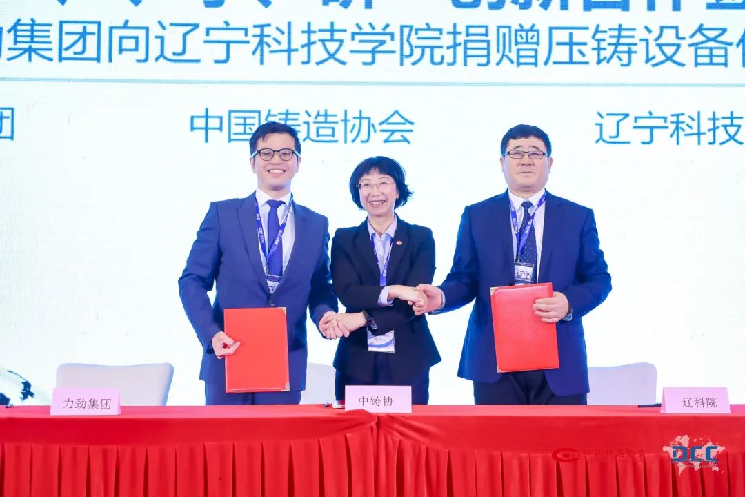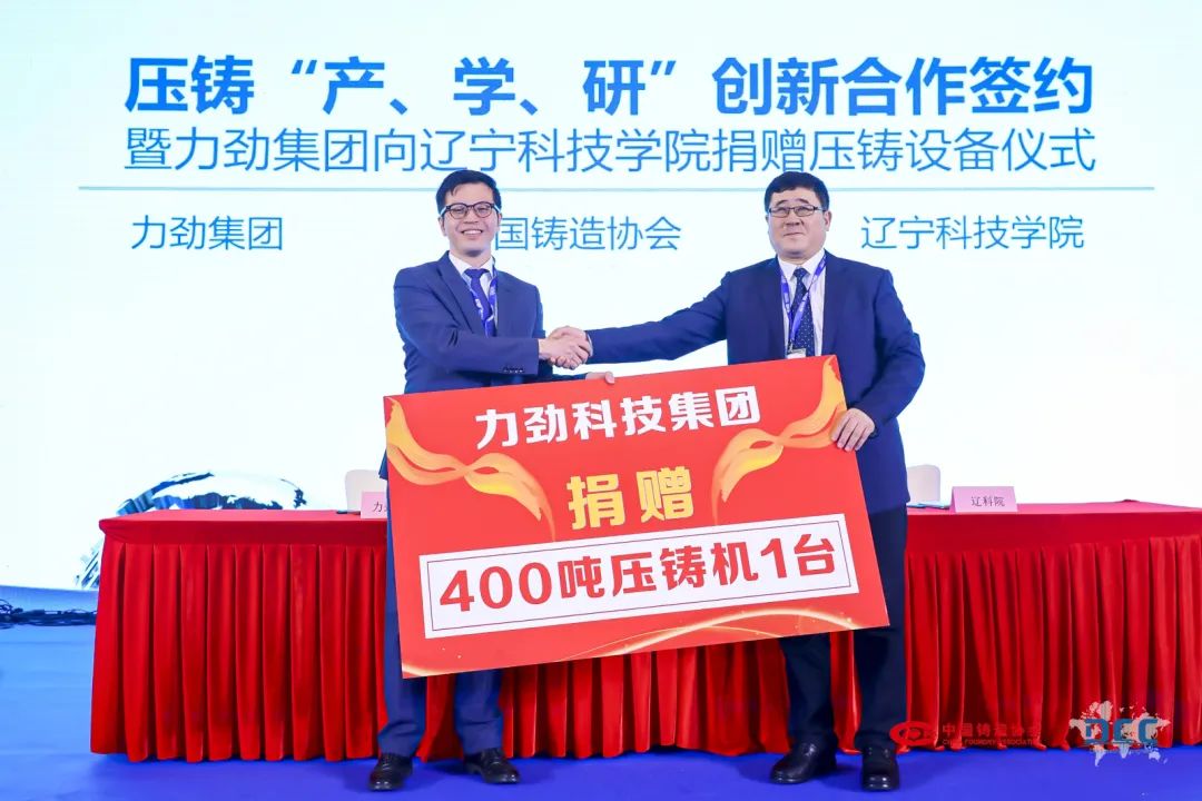 隨后,中國鑄造協(xié)會(huì)、力勁集團(tuán)、遼寧科技學(xué)院共同舉行“產(chǎn)、學(xué)、研”創(chuàng)新合作簽約暨力勁集團(tuán)向遼寧科技學(xué)院捐贈(zèng)壓鑄設(shè)備儀式。通過整合壓鑄領(lǐng)域優(yōu)質(zhì)資源,以達(dá)到在教學(xué)、實(shí)訓(xùn)、創(chuàng)新、交流等方面開展起密切的合作,三方將發(fā)揮各自優(yōu)勢,互利合作,構(gòu)建“協(xié)、企、校”共贏的共同體,從根本上促進(jìn)產(chǎn)學(xué)研深度融合,為中國壓鑄領(lǐng)域培養(yǎng)高素質(zhì)技術(shù)技能人才,推動(dòng)中國壓鑄領(lǐng)域?qū)崿F(xiàn)高質(zhì)量和可持續(xù)發(fā)展。