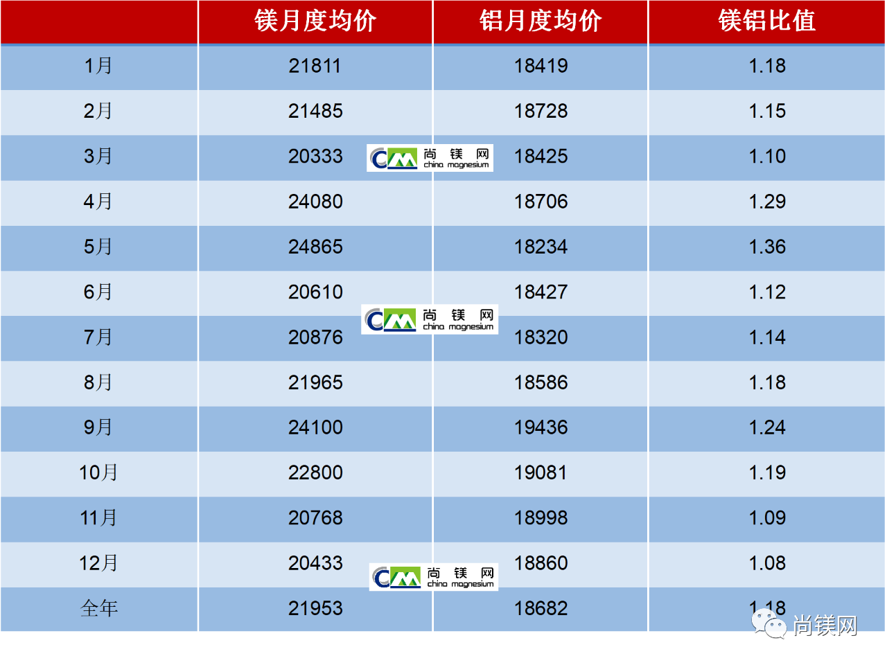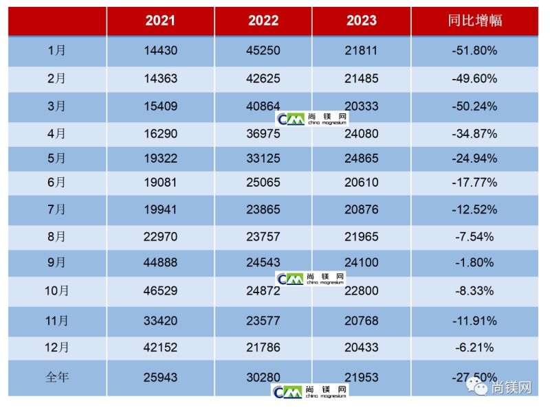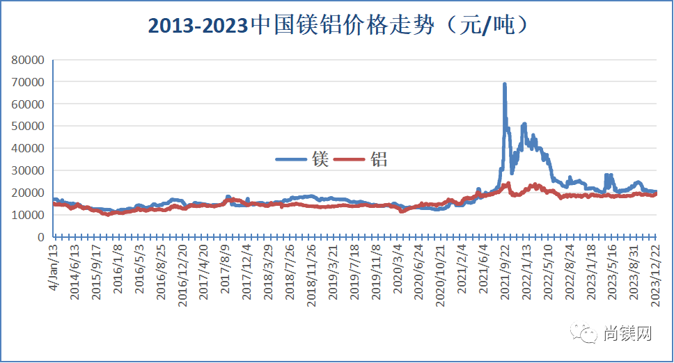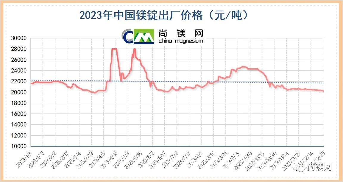![]() 尚鎂網(wǎng)發(fā)布2023年全年鎂市場(chǎng)價(jià)格數(shù)據(jù) 2023年中國(guó)鎂錠價(jià)格總體下行并低位區(qū)間波動(dòng)運(yùn)行,從年初的21600元/噸,下跌至年底20200元/噸,20000元成為重要的支撐線。受府谷地區(qū)鎂廠配套蘭炭設(shè)施環(huán)保改造行動(dòng)影響,期間在4月中旬和5月中旬9月下旬曾經(jīng)短暫回彈,從10月中旬開(kāi)始繼續(xù)下行。2023年底的鎂價(jià)格已經(jīng)跌回到2021年7月水平,為32個(gè)月來(lái)最低值。全年鎂價(jià)格月度平均值從1月份的21811元/噸,跌至12月份的20433元/噸。