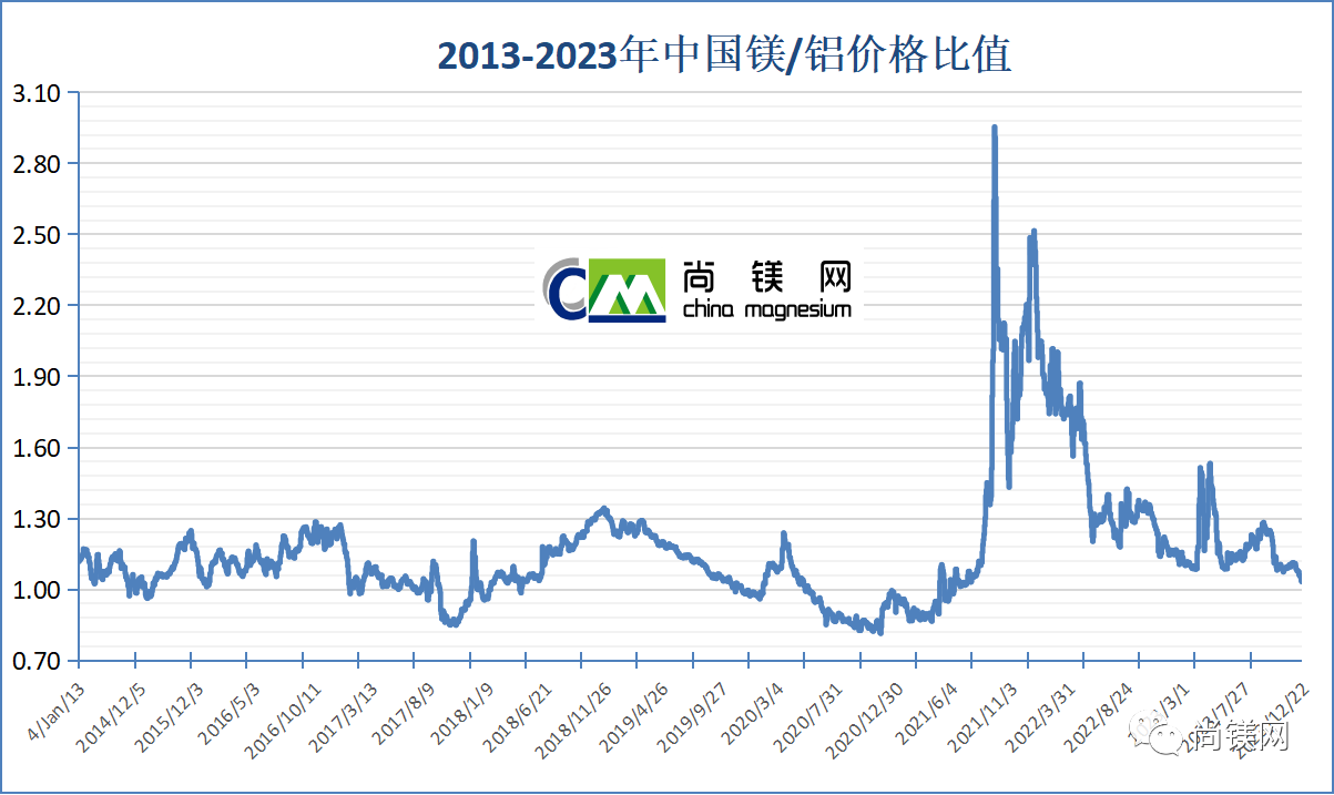 在2023年,鎂價(jià)格與鋁價(jià)格的比值也維持低位,有9個(gè)月都在1.2以下,最低達(dá)到1.08,年底為1.18。可以說(shuō),這一比值已經(jīng)回到合理區(qū)間。鎂鋁比值的回歸,是有利于鎂合金應(yīng)用的重要信號(hào)。2024年,預(yù)計(jì)鎂鋁比值仍然會(huì)保持在合理區(qū)間并很大可能繼續(xù)下降,相關(guān)下游用戶應(yīng)該重新恢復(fù)鎂市場(chǎng)穩(wěn)定供應(yīng)的信心。 2023年中國(guó)鎂錠與鋁錠月度平均價(jià)及鋁鎂比值(元/噸)