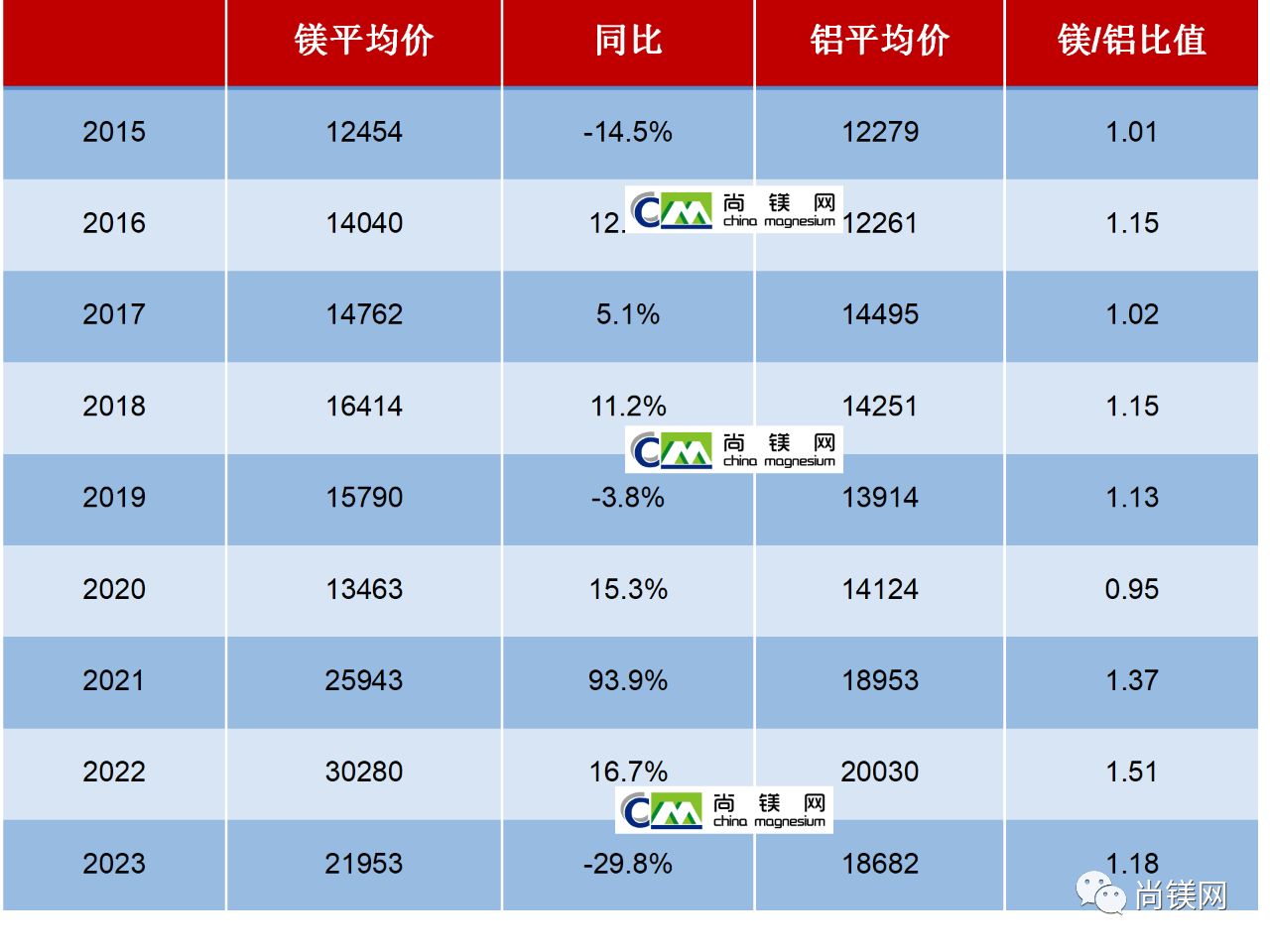2015-2023年中國(guó)鎂錠與鋁錠年度平均價(jià)及鋁鎂比值(元/噸)