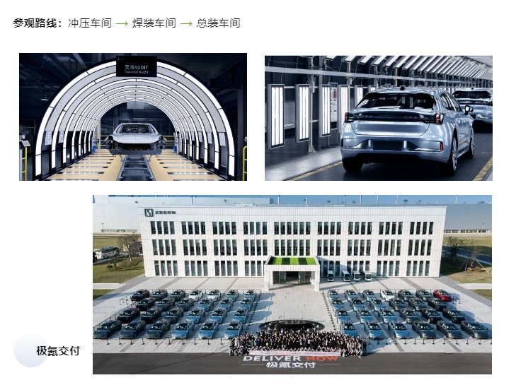 線路六:吉利汽車—杭州灣二廠 吉利汽車寧波杭州灣第二制造基地坐落在寧波市慈溪市,占地超千畝、總投資超百億元,擁有沖壓、焊裝、涂裝、總裝四大完整工藝,是吉利首個CMA架構(gòu)工廠。該基地作為吉利4.0時代的一座“超級兵工廠”,嚴(yán)格按照豪華車開發(fā)和制造標(biāo)準(zhǔn),整合全球優(yōu)質(zhì)資源,融入中國駕駛DNA產(chǎn)品誕生體系,是吉利汽車重磅打造的汽車整車項(xiàng)目。
