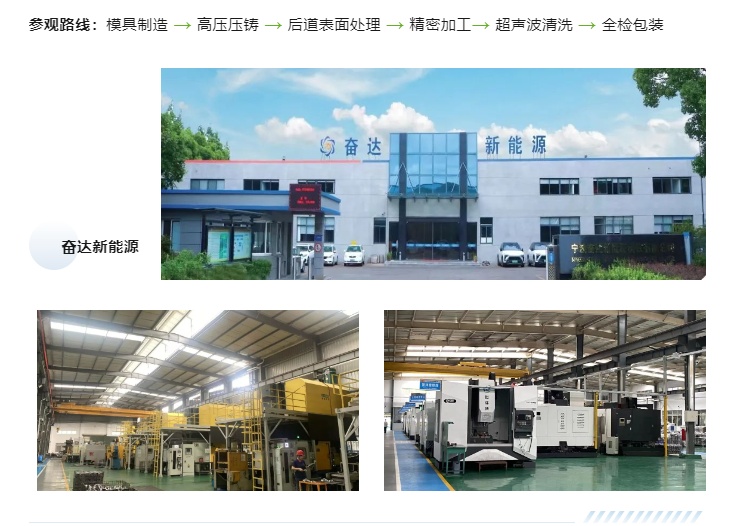 線路四:寧波奮達(dá)新能源科技有限公司 寧波奮達(dá)新能源科技有限公司前身為寧波北侖奮達(dá)模具有限公司,成立于2006年,是一家集模具設(shè)計(jì)與制造、壓鑄件生產(chǎn)與加工為一體的專業(yè)制造企業(yè)。主要產(chǎn)品為新能源汽車的電控箱殼體、電機(jī)殼體和水泵殼體等零部件。 公司現(xiàn)有廠房面積15000㎡,擁有400T-2000T大型鋁壓鑄機(jī)6臺,高速/高精度加工中心65臺,高精度攪拌摩擦焊、電加工機(jī)床、表面處理及其他精密專用設(shè)備30余臺。同時,公司配備蔡司、愛德華三坐標(biāo)各1臺,工業(yè)CT1臺,牛津日立光譜儀1臺以及氣密性檢測儀若干臺,現(xiàn)已通過IATF 16949:2016質(zhì)量體系認(rèn)證。 公司以“產(chǎn)品做精”為理念,始終堅(jiān)持“零缺陷”的質(zhì)量原則、“以質(zhì)量求生存、以信譽(yù)求發(fā)展”的經(jīng)營方針,不斷進(jìn)行技術(shù)創(chuàng)新,努力成為新能源汽車電控箱殼體制造“綜合實(shí)力強(qiáng),發(fā)展速度快”的后起之秀。