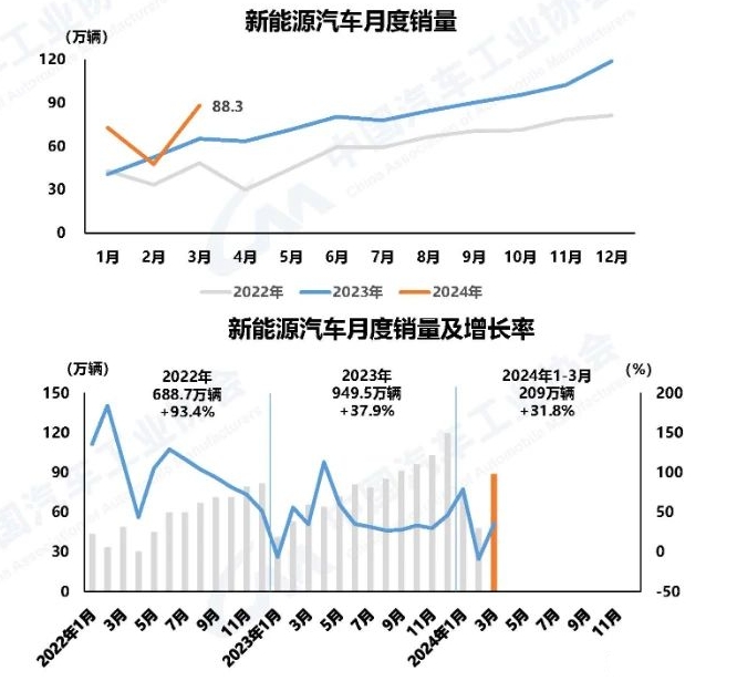 新能源汽車作為汽車行業(yè)的亮點,持續(xù)展現(xiàn)出強勁的增長勢頭。3月,新能源汽車的產(chǎn)銷分別完成86.3萬輛和88.3萬輛,同比分別增長28.1%和35.3%,市場占有率更是達到了32.8%。1-3月,新能源汽車累計產(chǎn)銷量均實現(xiàn)了超過30%的同比增長,市場占有率達到31.1%。