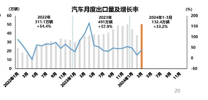值得一提的是,汽車出口方面也表現(xiàn)出色。3月,汽車出口量達到50.2萬輛,環(huán)比增長33%,同比增長37.9%。1-3月,汽車累計出口量同比增長33.2%,展現(xiàn)出強勁的增長勢頭。