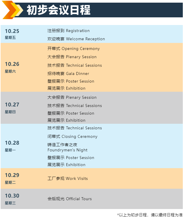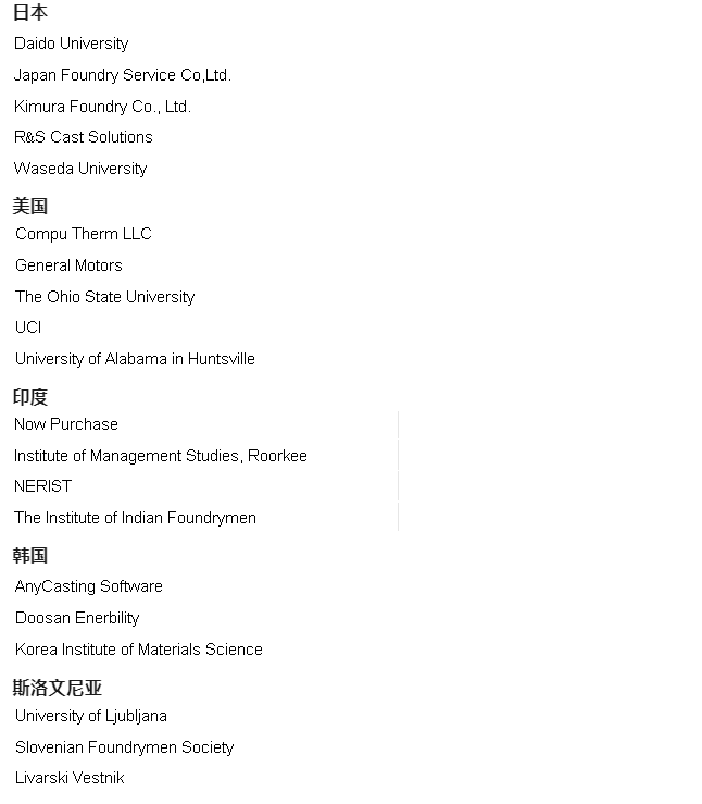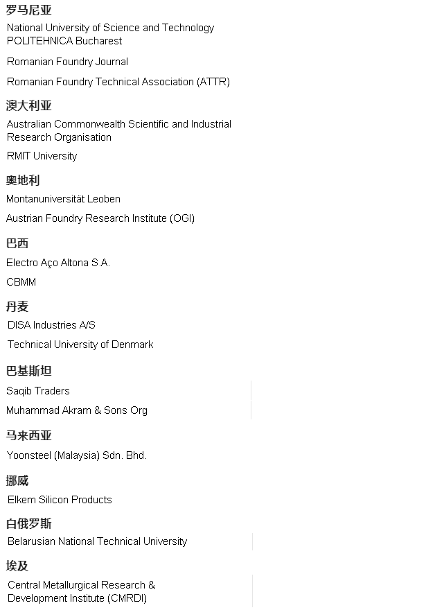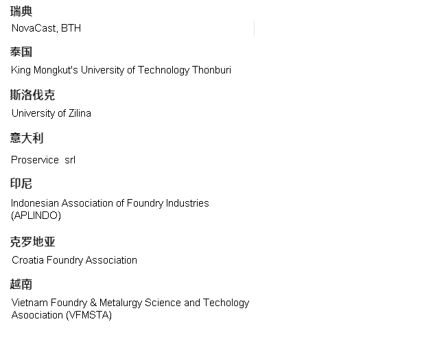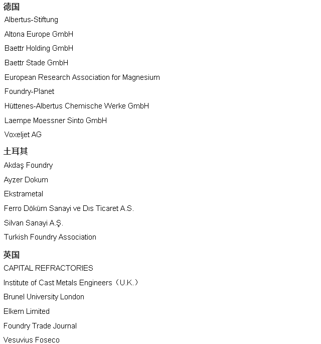 聯合承辦: 協辦單位: 全國鑄造標準化技術委員會 清華大學 上海交通大學 華中科技大學 四川大學 哈爾濱工業大學 東南大學 山東大學 西北工業大學 華南理工大學 吉林大學 大連理工大學 重慶大學 北京科技大學 南京理工大學 東北大學 北京交通大學 鄭州大學 上海大學 暨南大學 武漢理工大學 中國礦業大學 河海大學 中國地質大學 東華大學 合肥工業大學 上海理工大學 河北工業大學 齊魯工業大學 南昌航空大學 河南科技大學 中北大學 沈陽工業大學 蘭州理工大學 煙臺大學核裝備與核工程學院 哈爾濱理工大學 東莞理工學院 太原科技大學 閩江學院 湖北汽車工業學院 太原理工大學 西安交通大學 西安理工大學 四川工程職業技術大學 中國科學院金屬研究所 中國兵器工業第五九研究所 北京航空材料研究院 中國科學院寧波材料技術與工程研究所 包頭稀土研究院 德陽廣大東汽新材料有限公司 二重(德陽)重型裝備有限公司 一汽鑄造有限公司 四川德恩精工科技股份有限公司 清潔高效透平動力裝備全國重點實驗室 江蘇省機械工程學會鑄造專業委員會 江蘇省鑄造協會 浙江省機械工程學會鑄造分會 浙江省鑄造行業協會 山西省機械工程學會鑄造專業委員會 山西省鑄造行業協會 四川省鑄造協會 四川省機械工程學會鑄造分會 河南省機械工程學會鑄造分會 河南省鑄鍛工業協會 山東省鑄造協會 遼寧省機械工程學會鑄造分會 遼寧省鑄鍛行業協會 福建省機械工程學會鑄造專業委員會 福建省鑄造行業協會 香港鑄造業總會 湖北省機械工程學會鑄造專業委員會 湖北省鑄造協會 廣西機械工程學會鑄造分會 廣西鑄造協會 廣東省機械工程學會鑄造分會 廣東省鑄造行業協會 內蒙古機電工程學會鑄造專業委員會 安徽省機械工程學會鑄造專委會 貴州省機械工程學會鑄造分會 云南省機械工程學會鑄造分會 甘肅省機械工程學會鑄造專業委員會 新疆機械工程學會鑄造專業委員會 吉林省鑄造協會 重慶市機械工程學會鑄造分會 重慶市鑄造協會 西安市鑄造學會 中車戚墅堰機車車輛工藝研究所股份有限公司 機械工業第六設計研究院有限公司 濟南圣泉集團股份有限公司 維蘇威鑄造科技(江蘇)有限公司 維捷(蘇州)三維打印有限公司 邁格碼(蘇州)軟件科技有限公司 廣西蘭科資源再生利用有限公司