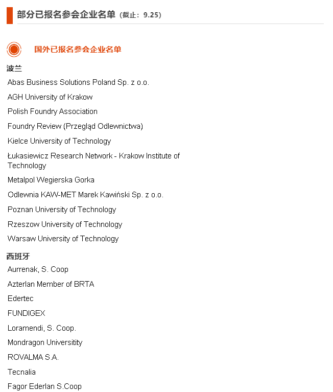 國內已報名參會企業名單 埃肯國際貿易(上海)有限公司 安徽煜銳三維科技有限公司 巴蒂士(嘉興)磨具科技股份有限公司 百鑄網 包頭市鑄造之友工業材料有限公司 包頭稀土研究院 北京奧宇可鑫表面工程技術有限公司 北京鋼研高納科技股份有限公司 北京機科國創輕量化科學研究院有限公司 北京交通大學 北京科技大學 北京仁創砂業鑄造材料有限公司 北京三帝科技股份有限公司 北京適創科技有限公司 博途新能源(徐州)有限公司 布勒(中國)機械制造有限公司 常州開源鑄造有限公司 常州中車汽車零部件有限公司 成都科深節能材料有限公司 成都乾旺鑄造材料有限公司 成都天城精密機械有限公司 成都鐵城航空機械有限公司 重慶大學 重慶卡森科技有限公司 重慶科技大學 重慶長江造型材料(集團)股份有限公司 大連交通大學 大連金泰汽車零部件有限公司 大連理工大學 大連迅科工業有限公司 丹東奧龍射線儀器集團有限公司 德陽廣大東汽新材料有限公司 德陽天和機械制造有限責任公司 德陽天元重工股份有限公司 德陽廣大東汽新材料有限公司 迪砂(常州)機械有限公司 東北大學 東方電氣集團東方汽輪機有限公司 東華大學 東南大學 東亞科技(蘇州)有限公司 都江堰市萬福金屬構件有限公司 《大型鑄鍛件》 鄂爾多斯市富華鑄造材料有限公司 二重(德陽)重型裝備有限公司 佛山大學 佛山峰合精密噴射成形科技有限公司 佛山市非特新材料有限公司 福建省益強硅砂科技有限公司 繁峙縣憨山通用機械股份有限公司 FSC跨國鑄造采購平臺 廣東省鑄力鑄材科技有限公司 廣西蘭科資源再生利用有限公司 國家高速列車技術創新中心 哈爾濱工業大學 哈爾濱吉星機械工程有限公司 哈爾濱理工大學 邯鄲悅欣新材料科技有限公司 邯鄲中昂新材料有限公司 杭州磨致機器人有限公司 河北工業大學 河北來福機械有限公司 河北龍鳳山鑄業有限公司 河北天琦新材料科技有限公司 河北蔚然建材科技有限公司 河海大學 河南工業大學 河南科技大學 河南省機械工程學會鑄造分會 恒屹新材料(山東)有限公司 湖北汽車工業工業學院 湖南嘉順華新材料有限公司 湖南精城特種陶瓷有限公司 華南理工大學 華南理工大學國家金屬材料近凈成形工程技術研究中心 華中科技大學 華中科技大學材料成形與模具技術全國重點實驗室 機械工業第六設計研究院有限公司 濟南圣泉集團股份有限公司 暨南大學 江蘇大學 江蘇恒立液壓股份有限公司常州鑄造分公司 江蘇省機械工程學會 江蘇天宏機械工業有限公司 江蘇亞威鑄造材料科技有限公司 江西科技師范大學 金耐源(河南)工業科技有限公司 晉城市銳錫鑄造有限公司 晉城市鑫恒瑞鑄造科技有限公司 晉江西峰天然石英砂有限公司 科萊恩化工科技(上海)有限公司 昆明理工大學 蘭州理工大學 樂山天華機械制造有限公司 洛陽赫特儀器設備有限公司 洛陽凱林鑄材有限公司 洛陽雙瑞精鑄鈦業有限公司 力勁科技集團 邁格碼(蘇州)軟件科技有限公司 美國鋁業中國研究院 南京航空航天大學 南京年達智能裝備科技有限公司 南京中科煜宸激光技術有限公司 內蒙古卓越高新材料有限公司 寧波賽爾斯金屬制品有限公司 寧波通達精密鑄造有限公司 歐區愛鑄造材料(中國)有限公司 攀枝花市恒豪鑄造有限公司 普友機械工業(遼寧)有限公司 青島九鼎鑄冶材料有限公司 青島汽車進出口有限公司 青島泰德機械有有限公司 青島天啟自動化工程有限公司 清華大學 曲阜冶通鑄材科技發展有限公司 泉州一核新材料科技有限公司 山東大學 山東泰力克新材料科技有限公司 山東鑫剛新材料有限公司 山東旭光得瑞高新材料股份有限公司 山西安信鑄造科技股份有限公司 山西富謙特種陶瓷有限公司 山西華翔集團股份有限公司 山西龍康機械制造有限公司 山西清慧勝凱科技股份有限公司 山西三聯順馳汽車配件有限公司 山西韶澤裝備(集團)有限公司 山西省機械工程學會鑄造專業委員會 山西中兵鑄造有限公司 山西中設華晉鑄造有限公司 山西中興鑄業集團有限公司 陜西方園冶金設備有限公司 上海博優模具材料有限公司 上海大學 上海交通大學 上海凱比拓耐火材料科技有限公司 上海理工大學 沈陽埃克斯邦科技有限公司 沈陽工業大學 沈陽匯亞通鑄造材料有限責任公司 四川大學 四川德恩精工科技股份有限公司 四川東樹新材料有限公司 四川法拉特不銹鋼鑄造有限公司 四川工程職業技術大學 四川合一電氣科技有限公司 四川華通偉業機械設備制造有限公司 四川省高品易鑄造材料有限公司 四川省鑄造協會 四川眾安耀德精密機械有限公司 蘇州大學 蘇州明志科技股份有限公司 蘇州興業材料科技股份有限公司 帥翼馳新材料集團有限公司 太原科技大學 太原理工大學 太原市尖山益達鑄造有限公司 唐山市慧芳保溫材料有限公司 天津艾科賽機械設備有限公司 天津中屹銘科技有限公司 天津重型裝備工程研究有限公司 通遼市大林型砂有限公司 《特種鑄造及有色合金》 維捷中國 維蘇威鑄造科技(江蘇)有限公司 無錫市貝爾機械股份有限公司 無錫市天山鑄造材料有限公司 五洋百川(青島)智能設備有限公司 武漢理工大學 武漢武重鑄鍛有限公司 濰柴動力股份有限公司 西安交通大學 西安理工大學 西北工業大學 西南交通大學 香港大學 香港