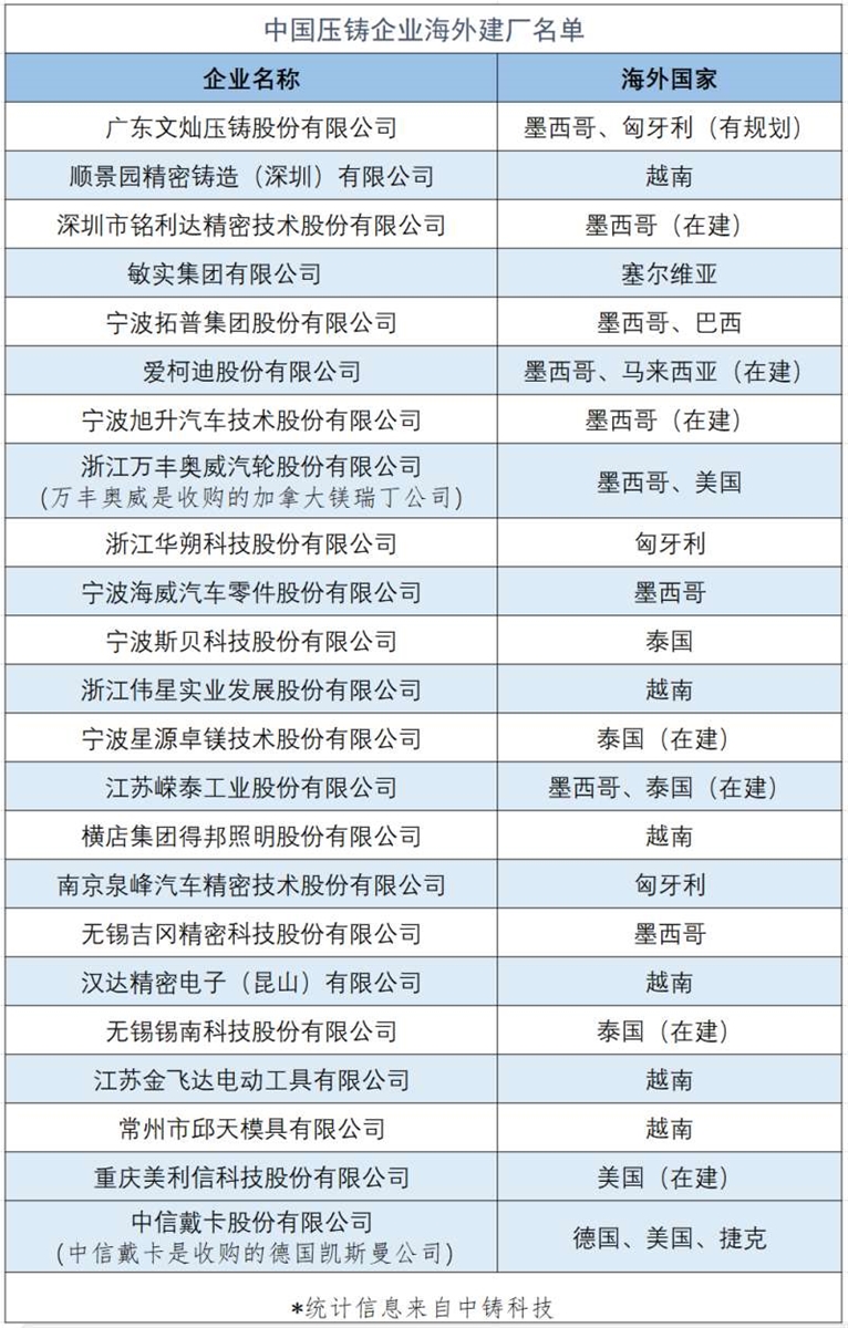 ![]() 近年來,隨著壓鑄企業“國際化”步伐的加快,許多國內企業紛紛在歐洲、美洲、東南亞等全球投資設廠,這一趨勢已經成為行業內的熱門話題。為了給業界提供參考,特此整理了在海外建廠的中國壓鑄企業名單。