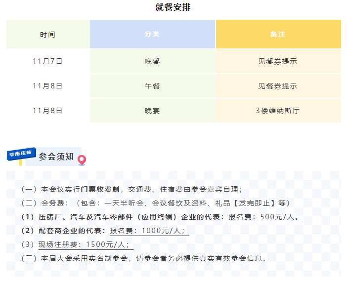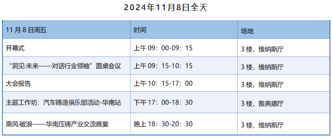 ![]() 會(huì)前必看!2024華南壓鑄產(chǎn)業(yè)會(huì)議 大會(huì)日程及參會(huì)指南 2024華南壓鑄產(chǎn)業(yè)會(huì)議,將于2024年11月7日-8日在深圳維納斯皇家酒店隆重舉行。大會(huì)由行業(yè)知名媒體《壓鑄周刊》主辦,旨在引進(jìn)全國優(yōu)質(zhì)資源,打造華南壓鑄界最專業(yè)的會(huì)議平臺(tái)。 為提升大會(huì)品質(zhì)和會(huì)議報(bào)告質(zhì)量,也讓各位嘉賓更靈活、高效地安排行程,會(huì)務(wù)組在此簡述報(bào)到流程以及參會(huì)、交通指引等需要注意的事項(xiàng),期待您的到來! 會(huì)議信息|嘉賓報(bào)到