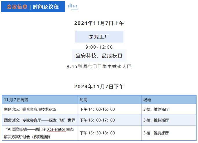 報(bào)到時(shí)間:2024年11月7日09:00-18:00 地點(diǎn):深圳維納斯皇家酒店(深圳國際會(huì)展中心店) 注意事項(xiàng): 1、提前注冊(cè):簽到時(shí)請(qǐng)出示邀請(qǐng)短信或其他有效證件到酒店二樓大堂會(huì)議簽到處簽到登記,并領(lǐng)取會(huì)務(wù)資料,包括參會(huì)證件、會(huì)議會(huì)刊等。 2、您的胸卡是進(jìn)入會(huì)場、工廠參觀的重要憑證,請(qǐng)隨身攜帶,遺失不補(bǔ)。 3、請(qǐng)務(wù)必注意提交信息的準(zhǔn)確性,包括姓名、身份證、電話、郵箱等信息,付費(fèi)后信息均不可修改。 4、可關(guān)注《壓鑄周刊》微信公眾號(hào)“壓鑄WEEKLY”獲取會(huì)議最新信息。 5、工廠參觀(須提前報(bào)名,不接受現(xiàn)場報(bào)名)。