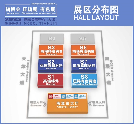 鎂合金鑄造集中展示區 低壓鑄造產業鏈展示區 半固態工藝產業鏈展示區 擠壓成型工藝產業鏈展示區 高壓鑄造國際集中展示區 展館布局