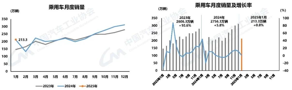 ![]() 2月17日,中國汽車工業(yè)協(xié)會發(fā)布了2025年1月汽車工業(yè)產(chǎn)銷情況。1月,汽車產(chǎn)銷分別完成245萬輛和242.3萬輛,環(huán)比分別下降27.2%和30.5%,產(chǎn)量同比增長1.7%,銷量同比下降0.6%。 中國汽車工業(yè)協(xié)會表示,今年1月我國汽車行業(yè)總體保持穩(wěn)定運(yùn)行。其中,乘用車延續(xù)良好表現(xiàn),產(chǎn)銷量同比雙增;新能源汽車產(chǎn)銷和汽車出口也延續(xù)了良好態(tài)勢。 數(shù)據(jù)顯示,1月乘用車產(chǎn)銷分別完成215.1萬輛和213.3萬輛,同比分別增長3.3%和0.8%。