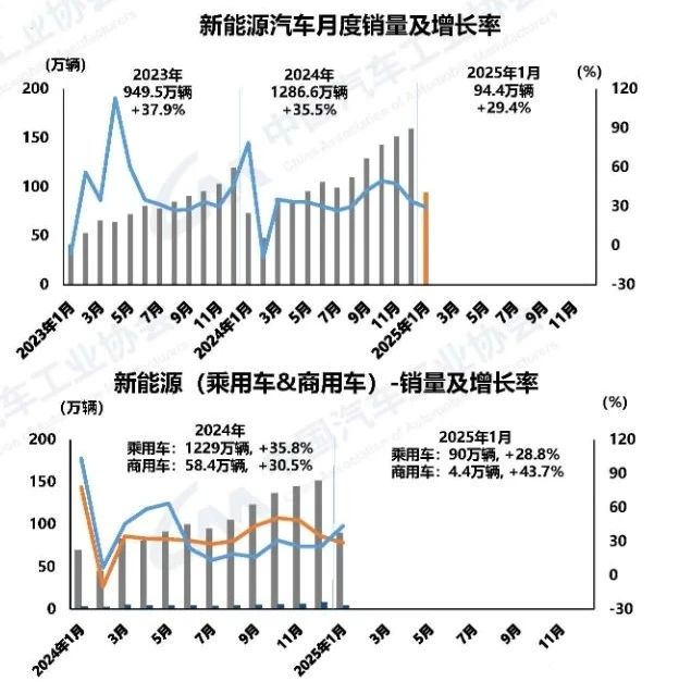在新能源汽車方面,1月新能源汽車產(chǎn)銷分別完成101.5萬輛和94.4萬輛,同比繼續(xù)保持較快增長,分別增長29%和29.4%。新能源汽車新車銷量占汽車新車總銷量的38.9%。