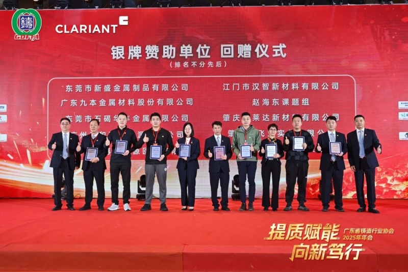 本次大會的成功舉辦,離不開眾多贊助商的慷慨解囊與鼎力支持。主辦方特別感謝本次春茗晚宴獨家冠名單位科萊恩化工科技(上海)有限公司。金牌贊助商廣東揚山聯合精密制造股份有限公司、嘉瑞科技(惠州)有限公司、廣東雄新壓鑄有限公司、廣東金志利科技股份有限公司、廣東省鑄力鑄材科技有限公司、伊之密股份有限公司、佛山市南海區晉遠達焦鐵有限公司、湖南鑫泉科技有限公司、廣東中天創展球鐵有限公司、宏豐金屬制品(惠州)有限公司、禹州市恒利來新材料股份有限公司、廣東肇慶動力金屬股份有限公司。銀牌贊助商東莞市新盛金屬制品有限公司、廣東九本金屬材料股份有限公司、東莞市石碣華豐金屬有限公司、廣州三和再生資源有限公司、中山市潤興再生資源回收有限公司、江門市漢智新材料有限公司、趙海東課題組、肇慶美萊達新材料有限公司、肇慶市飛亞實業有限公司、廣州海購新材料有限公司。主辦方為他們頒發了紀念獎牌。