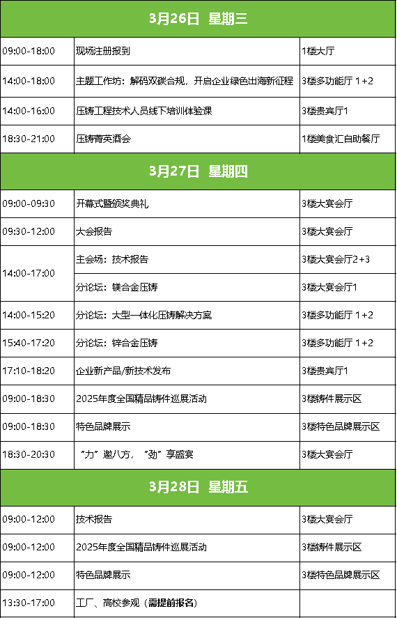 ![]() 2025年全國壓鑄行業年會—第二十屆中國國際壓鑄會議將于3月26-28日在南京富力萬達嘉華酒店舉辦,旨在匯聚全球學術界、企業界、車廠等各方力量,搭建一個高端對話與合作的平臺。會議以“鏈動全球壓鑄”為目標,與全球壓鑄同仁一起剖析壓鑄行業最新發展趨勢,探討競爭格局,為行業未來發展提前布局、科學規劃提供一些思路。誠邀壓鑄同仁蒞臨參會! 活動一覽表
