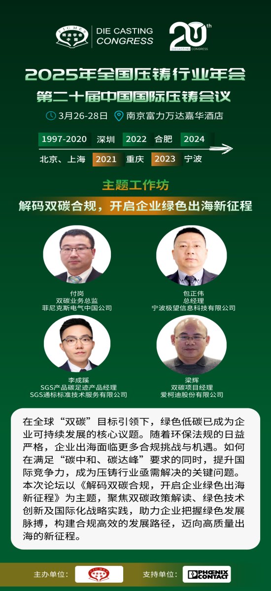 2025年全國壓鑄行業(yè)年會—第二十屆中國國際壓鑄會議將于3月26-28日在南京富力萬達(dá)嘉華酒店舉辦,截止目前會議已邀請到小米、特斯拉、蔚來、理想、東風(fēng)、廣汽、極氪、寶馬、蘋果、奇瑞、華為、上汽、福特、通用、奧迪等主流車廠及通訊廠商,愛柯迪、鴻圖、文燦、萬安、一汽鑄造、華朔、美利信、渝江、GF 、DGS、漢特曼、嘉瑞、航特、諾瑪科、亞德林、寶武鎂業(yè)、布雷博、中信戴卡、艾斯迪等知名鑄件企業(yè)蒞臨參會。