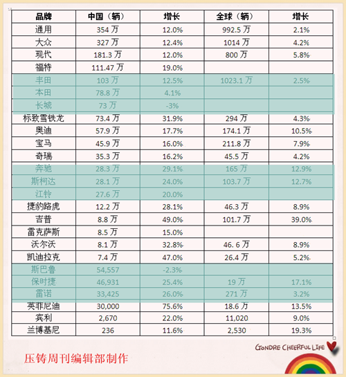 汽車(chē)制造業(yè)是壓鑄產(chǎn)業(yè)最大的用戶行業(yè),可以說(shuō)中國(guó)壓鑄業(yè)十多年所取得的成就,汽車(chē)制造業(yè)的高速發(fā)展對(duì)壓鑄件巨大需求起到了至關(guān)重要的促進(jìn)作用。因此關(guān)注汽車(chē)業(yè)發(fā)展是非常有必要的。2014年,中國(guó)汽車(chē)產(chǎn)銷(xiāo)量雙雙突破2300萬(wàn)輛,連續(xù)六年蟬聯(lián)世界第一。以下為壓鑄周刊編輯整理有關(guān)2014年各大汽車(chē)廠商在中國(guó)和全球的整車(chē)銷(xiāo)量情況表。