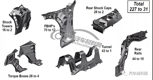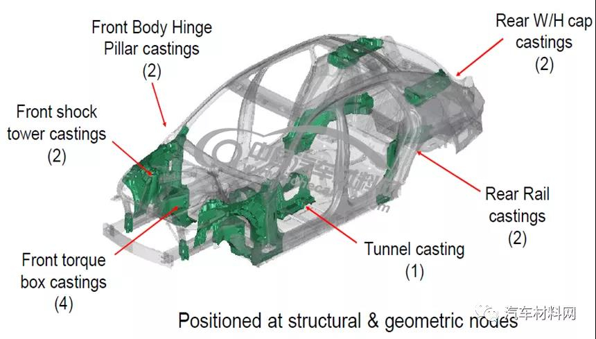 IDRA的大型鋁合金壓鑄設備 馬斯克表示,Model 3的后底板結構有70多個部件組成(包括沖壓件、擠壓件和鑄造件),這種拼接的方式將為后續的維修等帶來麻煩。而Model Y的一體式鋁合金壓鑄件將有效減少零部件數量。Harbour也表示,一體式大型鋁鑄件的使用可以省去零件的組裝工序,從而大約可以節省20%的人工成本,同時減少碳排放。 ●潛在的問題分析● Munro表示,在適應不同軸距的車型架構時,與更換模具相比,大型鑄件的使用將進一步降低生產成本。但同時,“鑄件不能很好地修復,如果在撞擊過程中受到嚴重損傷,那么可能造成整輛車的報廢。”Munro稱,特斯拉計劃每年從Model Y架構平臺上組裝多達100萬輛汽車,因此其對Giga Press的投資是合理的。大型鋁鑄件的應用也展示了特斯拉在車身設計和先進技術應用方面的不斷研究與進步。 ●鑄造鋁合金在車身上的應用情況● 鑄造鋁合金具有設計自由度大、易成型等特點,在車身系統中的應用部位主要分布在減震塔、縱梁、接頭、中通道、前豎板等部件。典型應用車型還有Cadillac CT6,其將原來227個鋼制零件集成為31個鑄鋁件。