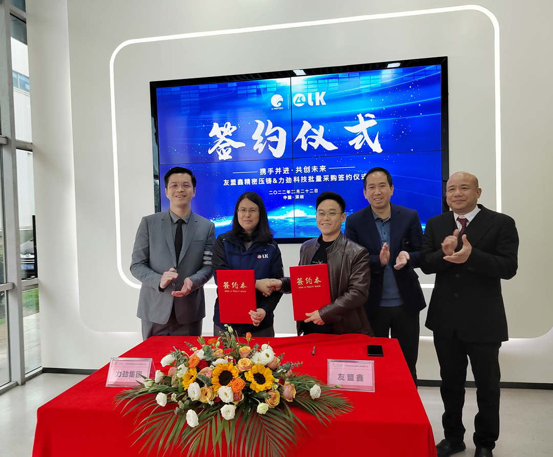 簽約儀式前,雙方舉行座談會(huì) 潘玲玲女士感謝友盟鑫公司高層對(duì)力勁品牌的認(rèn)可。她介紹了力勁集團(tuán)的企業(yè)情況,以及在新能源汽車與“一體化壓鑄”、傳統(tǒng)汽車零部件、5G通訊、建筑模板等應(yīng)用領(lǐng)域的技術(shù)、裝備及解決方案開發(fā)與制造實(shí)力。 潘玲玲女士感謝友盟鑫公司高層對(duì)力勁品牌的認(rèn)可,她介紹了力勁集團(tuán)在新能源汽車與“一體化壓鑄”、5G通訊、建筑模板等應(yīng)用領(lǐng)域的技術(shù)、裝備及解決方案開發(fā)與制造實(shí)力,以及與國(guó)內(nèi)外知名汽車(含新能源)零部件、通信、建材廠商的合作案例。 黃忠友先生感謝促成本次采購(gòu)簽約的雙方人員。他表示:“經(jīng)過(guò)雙方一年多的交流和洽商,樹立了我們對(duì)力勁設(shè)備品質(zhì)與服務(wù)的信心,開啟彼此合作的征程。此次引進(jìn)力勁12套壓鑄設(shè)備,是友盟鑫公司為適應(yīng)市場(chǎng)發(fā)展需求,布局新能源汽車領(lǐng)域,拓展新業(yè)務(wù),所購(gòu)設(shè)備將用于生產(chǎn)鎂鋁合金壓鑄零部件。新設(shè)備的采購(gòu)將為公司未來(lái)發(fā)展注入新的動(dòng)能。” 錢子飛先生表示:“友盟鑫是LED鎂鋁壓鑄箱體領(lǐng)域的龍頭企業(yè),在該領(lǐng)域占有30%的市場(chǎng)份額,25%產(chǎn)品出口海外。隨著企業(yè)不斷地發(fā)展,順應(yīng)客戶多元化的需求,我們將產(chǎn)品線延伸至汽車、通訊、軍工等領(lǐng)域,并在重慶銅梁投資新生產(chǎn)基地項(xiàng)目。此次采購(gòu)的壓鑄設(shè)備將投放于此。”