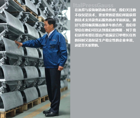 為什么"無曲拐"是江中光電的未來 與基于帶曲拐的三板機設計相比,意特佩雷斯高斯的TF無曲拐兩板機系列高壓壓鑄機提供更小的設備占地面積,更強的剛性和更少的易損件,以提高可靠性和性能。這一組合完美地滿足了江中的需求,同時在生產中對環境更友好。 我們與意特佩雷斯高斯的合作已經超過15年,意特的高壓壓鑄設備始終保持在非常高的水平上,提供一致的穩定性和先進性,這對我們的生產至關重要。 --許應龍先生, 南通江中光電有限公司董事長 精益和高效的TF系列體現出了超強的生產能力。隨著大型鑄件成為壓鑄市場的焦點,兩臺新的TF2800和TF5700組成了一個范圍較廣的生產范圍,滿足了適應不斷變化的市場對壓鑄機的鎖模力要求。 服務支持是提升產能的關鍵 將南通的工廠運行壓鑄機總數增加到十臺,江中光電預計能夠將年產能提升至120萬級套梯級產品,在此基礎上進一步擴大超大型及大型汽車零部件的研發和生產。新的兩臺TF高壓壓鑄機將由意特佩雷斯高斯中國常州的生產基地制造,同時也由國內團隊提供技術支持與售后維護。