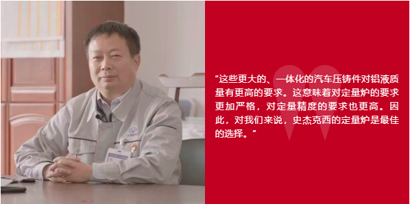 調整生產以滿足新能源汽車市場的需求,并符合 IIoT 的目標,一直是該公司的主要重點。大連亞明是中國工信部選出的“5G+工業(yè)互聯(lián)網”第一批典型解決方案供應商之一。 定量精度和服務支持 - 未來計劃的基礎 Westomat 定量爐——確切地來說是 45 臺定量爐,包括 1200kg、1700kg 和 2300kg 各種型號——在幫助大連亞明實現(xiàn)其生產目標方面已經發(fā)揮并將繼續(xù)發(fā)揮重要作用。 “史杰克西是世界上最好的定量爐供應商之一,我們通過使用Westomat定量爐無疑也發(fā)現(xiàn)了這一點。”大連亞明總經理方建儒先生說道, “十多年過去了,它們的定量精度及質量仍和剛出廠時一樣。而且也易于維護。只要我們需要服務或技術支持,史杰克西就在我們的身邊。” “這對于像我們這樣有雄心壯志的公司來說是非常重要的,這也是我們選擇史杰克西作為戰(zhàn)略合作伙伴的一個重要原因。史杰克西的 Westomat 定量爐非常適合自動化、高質量的生產。”--方建儒,大連亞明總經理 更大的鑄件依賴于更好的定量 大連亞明的另一個重點是尋找滿足日益增長的超大型壓鑄件市場需求的方法。 “史杰克西在新技術的研發(fā)總是走在世界前列,我相信他們將繼續(xù)應用先進的技術來幫助我們實現(xiàn)高精度、高效率的生產——尤其是在新能源汽車市場方面。”方總經理補充道。