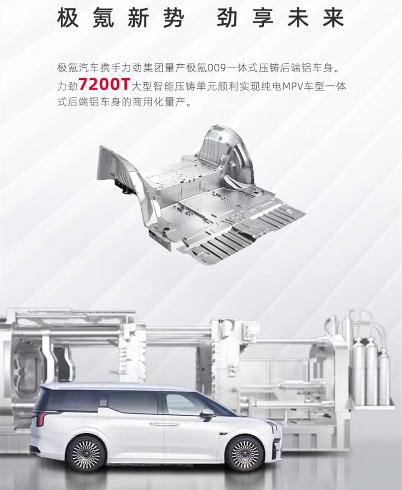11月1日,極氪汽車首款MPV車型(代號:EF1E)、全球首款原生純電豪華MPV——極氪009正式發(fā)布上市。一體式壓鑄后端鋁車身結(jié)構(gòu)件在發(fā)布會上首次向外界公布。 極氪009豪華MPV車體的后端鋁車身采用力勁7200T大型智能壓鑄單元一體化壓鑄成型。極氪汽車聯(lián)合力勁集團等產(chǎn)業(yè)合作伙伴,耗資13億元專項資金,傾心投入打造,突破了研發(fā)、材料與生產(chǎn)眾多環(huán)節(jié)的技術(shù)痛點與難點。 該一體式壓鑄后端鋁車身鑄件長1.4m,寬1.6米,相比傳統(tǒng)汽車制造的沖壓、焊接工藝,減少焊接點近800個,變形量減少16%,彎曲剛度提升11%。 極氪009擁有全球量產(chǎn)最大一體式壓鑄后端鋁車身,站在用戶的角度重新定義了豪華MPV,將MPV的豪華空間、SUV的強悍安全以及跑車的卓越操控融為一體,樹立了豪華MPV在設(shè)計、安全、豪華、性能和智能的全新基準(zhǔn),預(yù)計2023年1月正式開啟交付。