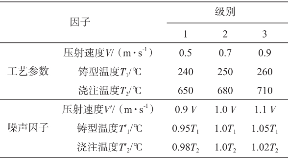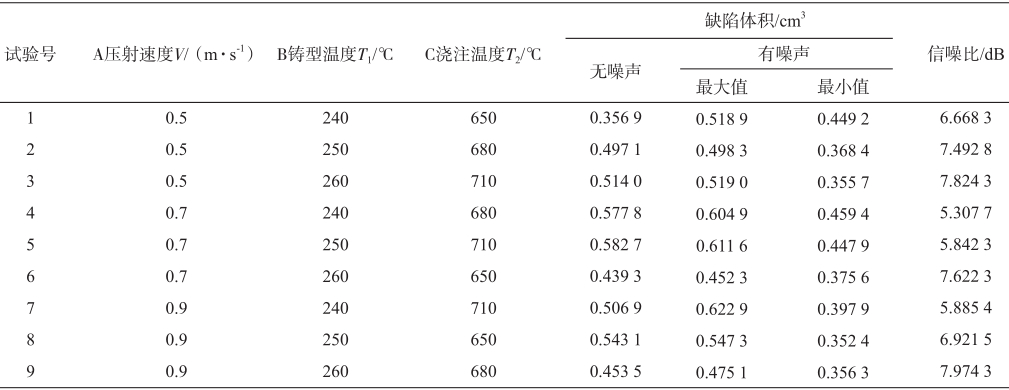 表2 工藝參數(shù)與噪聲因子級(jí)別 2.3 穩(wěn)健性評(píng)定及結(jié)果分析 2.3.1 壓鑄件網(wǎng)格劃分 三維模型以標(biāo)準(zhǔn)接口輸出STP格式。輸出文件通過(guò)GEOMESH進(jìn)行優(yōu)化,然后導(dǎo)入到ProCAST軟件中。采用MeshCAST網(wǎng)格劃分模快對(duì)三維造型進(jìn)行網(wǎng)格劃分。網(wǎng)格盡可能均勻,單元數(shù)量適當(dāng)。三維造型網(wǎng)格劃分后,節(jié)點(diǎn)數(shù)為110 553個(gè),單元總數(shù)為562 513個(gè)。根據(jù)流動(dòng)連續(xù)性原理,充填速度的三個(gè)水平值對(duì)應(yīng)的壓射速度分別為0.5 m/s、0.7 m/s和0.9 m/s。在ProCAST模塊中,模具的邊界條件選擇為空氣冷卻,界面?zhèn)鳠嵯禂?shù)設(shè)定為5 000 W/(m 2 ·K)。 2.3.2 虛擬正交試驗(yàn)結(jié)果分析 觀察壓鑄件的充填和凝固過(guò)程。計(jì)算虛擬試驗(yàn)中壓鑄件的缺陷的體積。由于所得缺陷體積越小越好。根據(jù)所期望的信噪比函數(shù)“望小特性”,將實(shí)驗(yàn)結(jié)果轉(zhuǎn)換為信噪比SN,分別計(jì)入各組實(shí)驗(yàn)中。信噪比(SN)是產(chǎn)品穩(wěn)定性的一個(gè)重要指標(biāo)。信噪比越大,產(chǎn)品的穩(wěn)定性越好。在虛擬正交試驗(yàn)中,計(jì)算壓鑄件在沒(méi)有噪聲和有噪聲的情況下的缺陷體積最小值和最大值,以及在噪聲因子影響下的信噪比的值(表3)。