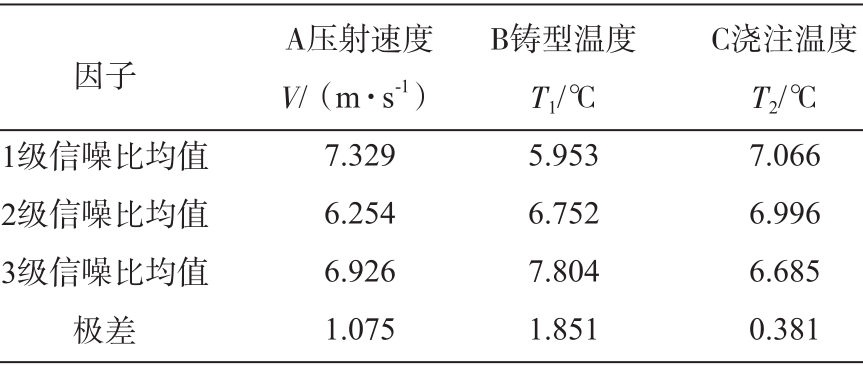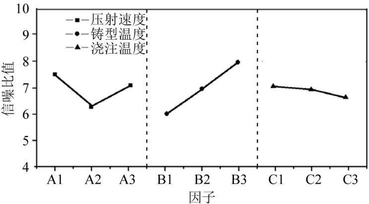 表3 虛擬工藝參數(shù)正交試驗(yàn)結(jié)果 從表3可以看出,在上述9組試驗(yàn)中,在沒(méi)有干擾因素的影響下,第1組壓鑄工藝參數(shù)的缺陷體積最小,相比質(zhì)量更穩(wěn)定。 信噪比的值對(duì)應(yīng)于各因素的水平。通過(guò)計(jì)算各級(jí)各因子的信噪比均值,進(jìn)一步獲得了信噪比因子水平的極差值。可以預(yù)測(cè)出針對(duì)試驗(yàn)?zāi)繕?biāo)響應(yīng)的測(cè)試因子的最佳組合,即一套保證了產(chǎn)品質(zhì)量的最穩(wěn)定壓鑄工藝參數(shù)。同時(shí),極差值的大小表示了相應(yīng)因素的影響大小,極差值較大,表明該因素較活躍,其變化對(duì)結(jié)果影響也很大;極差值較小,其變化對(duì)結(jié)果影響也很小。該算法簡(jiǎn)單、直觀,易于使用。在表4列出了信噪比均值和不同級(jí)別因素的極值的對(duì)比結(jié)果。 從表4可以看出,極差值最大對(duì)應(yīng)的是鑄型溫度,最小對(duì)應(yīng)的是澆注溫度,因此,試驗(yàn)因素的順序是鑄型溫度、壓射速度和澆注溫度。表4中各因素的平均信噪比用圖3表示,可以更直觀地解釋工藝參數(shù)對(duì)缺陷的影響。從圖3可以看出,當(dāng)壓鑄工藝參數(shù)的組合為A1B3C1時(shí),信噪比最大,即壓鑄件的質(zhì)量穩(wěn)健性最好。此時(shí),壓射速度為0.9 m/s,鑄型溫度為260 ℃,澆注溫度為680 ℃,與上述9組試驗(yàn)中第9組工藝參數(shù)正好吻合。若上述9組試驗(yàn)中沒(méi)有優(yōu)化得到的工藝參數(shù)組合,需要重新模擬和驗(yàn)證。
