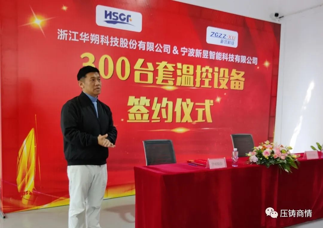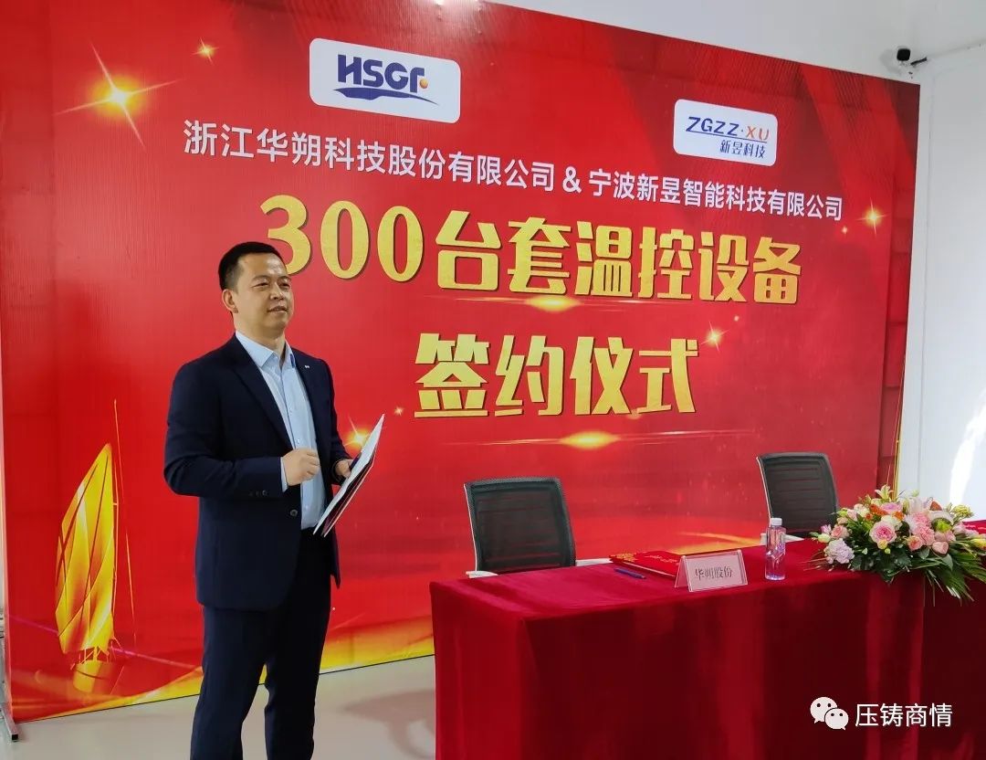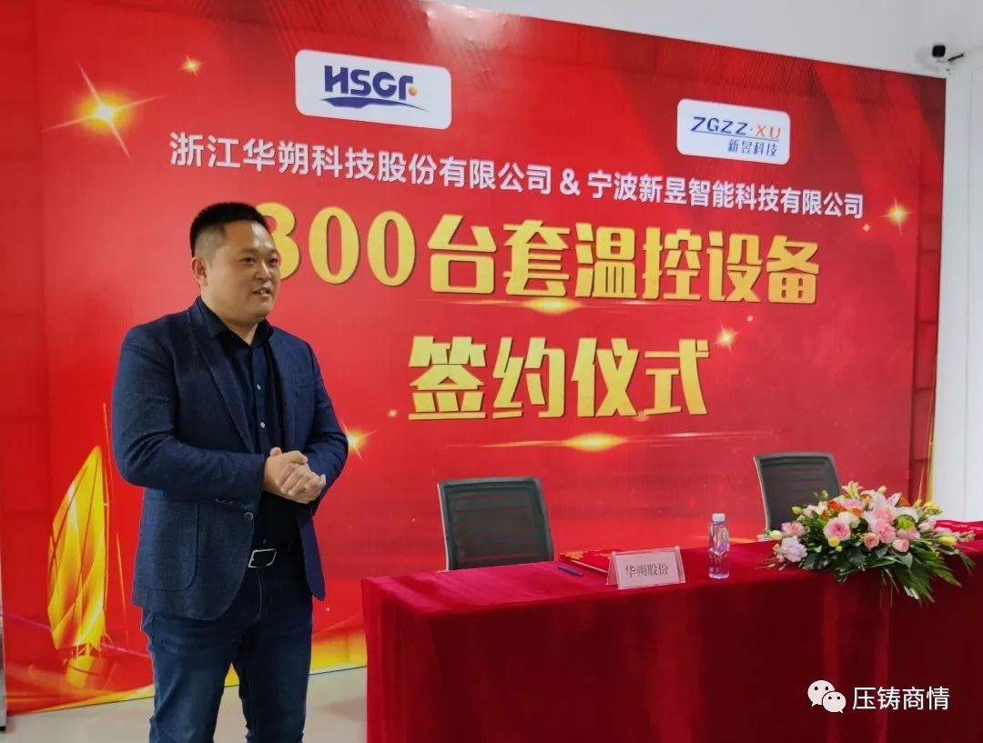 華朔股份CEO沈善忠先生、新昱科技總經(jīng)理王蘇華先生分別在簽約本上簽字 在活動現(xiàn)場,浙江華朔科技股份有限公司CEO沈善忠先生、寧波新昱智能科技有限公司總經(jīng)理王蘇華先生分別致辭,并在簽約本上簽字。根據(jù)協(xié)議,華朔股份向新昱科技采購300臺套壓鑄溫控設(shè)備,并于未來三年每年采購數(shù)百臺溫控設(shè)備,用于新上壓鑄單元及原有壓鑄生產(chǎn)線的設(shè)備升級改造。