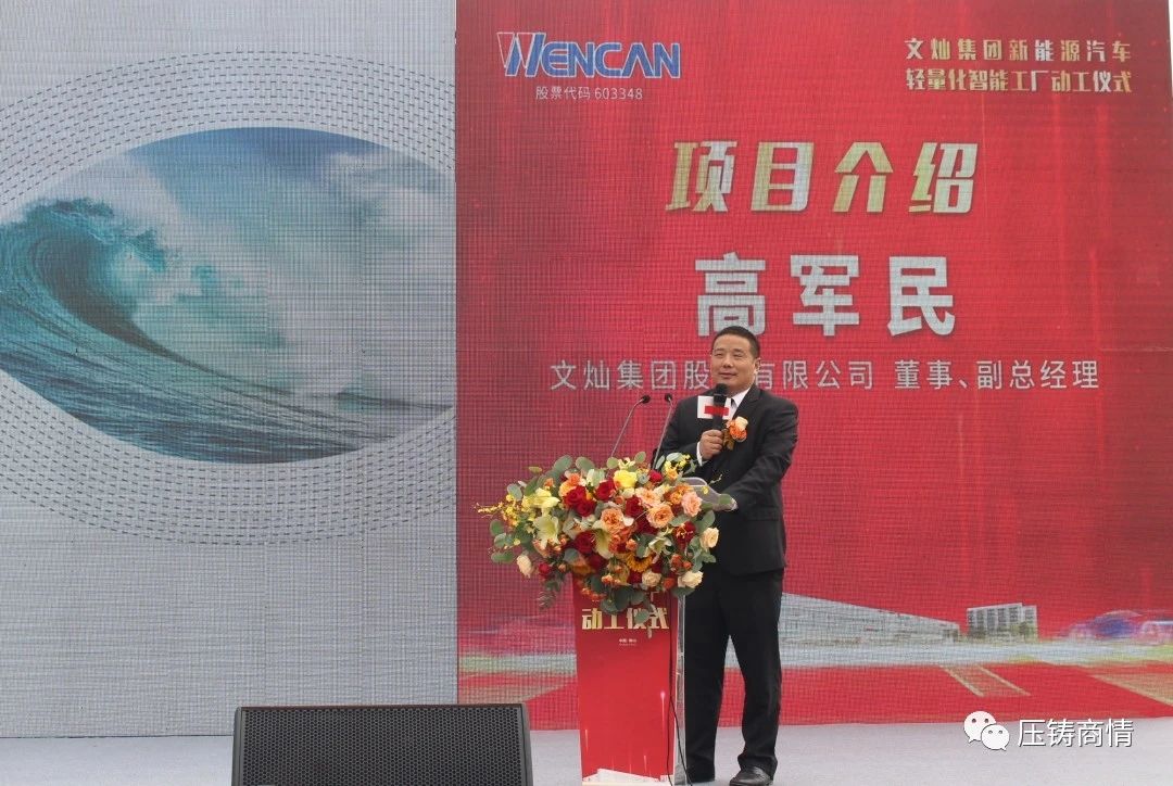 文燦集團執行董事、副總經理高軍民致辭 文燦集團執行董事、副總經理高軍民先生介紹了該項目的基本情況。他表示,新工廠將利用新能源汽車發展的機遇,跨入新一輪數智浪潮,采用先進生產線、管理系統,打造世界一流的壓鑄工廠,為廣東省新能源汽車產業集群、為里水經濟發展做出更大貢獻。新工廠定位優質的新能源汽車客戶,打造全球領先的高端自動化生產線、智能化數字工廠,提供行業領先的極具競爭力產品。