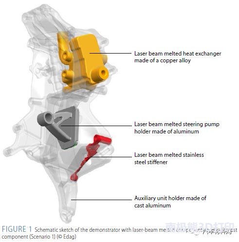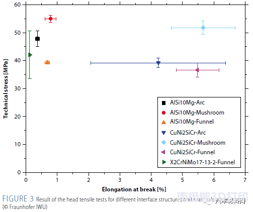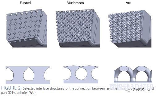 ![]() 圖1 激光熔化(Laser Beam Melting-LBM)和激光金屬粉末沉積技術(shù)(Laser Metal Deposition-LMD)具有可生產(chǎn)復(fù)雜形狀部件的優(yōu)勢,特別適用于復(fù)雜零部件的小批量生產(chǎn)。近年來,其在航空航天、醫(yī)療、汽車等領(lǐng)域有了越來越多的應(yīng)用。盡管如此,增材制造由于生產(chǎn)時間相對較長,生產(chǎn)成本較高,仍然很難實(shí)現(xiàn)工業(yè)生產(chǎn)。 與增材制造相比,壓鑄工藝可在短時間內(nèi)生產(chǎn)出大批量的產(chǎn)品。得益于高達(dá)12米/秒的填充速度,壓鑄部件的生產(chǎn)周期每個組件僅需幾分鐘就可完成。然而,擁有高生產(chǎn)效率的同時也有一些缺點(diǎn):如,高復(fù)雜程度的部件不能成型較難,且往往需要更為精細(xì)的模具。生產(chǎn)過程高機(jī)械強(qiáng)度、熔體的沖擊磨損以及較大的溫度波動都導(dǎo)致壓鑄模具較為昂貴。此外,一個模具一般只能生產(chǎn)一種形狀的零件。 作為Agent-3D聯(lián)合項(xiàng)目的一部分,由德國聯(lián)邦教育和研究部資助的CastAutoGen項(xiàng)目致力于將增材制造與壓鑄工藝相結(jié)合,形成混合工藝鏈,更好的發(fā)揮這兩種工藝的優(yōu)勢。工藝路線的設(shè)計(jì)充分考慮生產(chǎn)周期和成本因素,將簡單的大體積結(jié)構(gòu)區(qū)域采用壓鑄工藝制造,高功能化和復(fù)雜程度較高的部件區(qū)域采用二者相結(jié)合的工藝?;诖嗽O(shè)計(jì)了兩套工藝方案:方案1研究了將附加插入和裝配到單一模具中;方案2研究了如何通過LMD在單一壓鑄構(gòu)件上創(chuàng)建附加結(jié)構(gòu)。 1模具中附加零件的制造 方案1研究了利用激光束熔化技術(shù)實(shí)現(xiàn)復(fù)雜結(jié)構(gòu)壓鑄成形工藝。該方案中,加強(qiáng)筋、熱交換器、支架等結(jié)構(gòu)通過激光束熔化制造,然后插入模具,再這些部件周圍開始鑄造。具體如圖1。該方案還研究了不同幾何形狀的界面改性技術(shù),以達(dá)到更好的結(jié)合性。 研究者針對汽車輔助單元支架的壓鑄模具進(jìn)行改進(jìn),使得插件能模塊化的容納在模具中。在激光熔融工藝的設(shè)計(jì)和開發(fā)中,需特別注意連接區(qū)域結(jié)合界面的幾何形狀和表面修飾。因此,研究了如圖2所示的三種界面結(jié)構(gòu)的連接機(jī)械性能,拉伸試驗(yàn)結(jié)果如圖3所示。