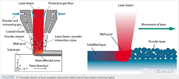 激光粉末沉積(LDP)是通過借助于聚焦激光束局部熔化基板表面將金屬或陶瓷填充材料以粉末形式焊接到金屬基板上的過程。如圖6(左)所示,填充材料首先通過吸收激光束能量熔化,然后再從熔池吸收熱量后完全熔化。該過程需在保護(hù)性氣體氣氛下進(jìn)行,以避免發(fā)生不需要的化學(xué)反應(yīng)。熔體通過散熱進(jìn)入部件而固化,形成焊珠。多個焊珠的堆疊形成整個三維結(jié)構(gòu)。適合的材料有鋼、鎳、鈷、鋁、銅、鈦等。 在激光束熔化中,如圖6(右)所示,組件是由粉末分層堆疊而成的。將組件的CAD文件分層導(dǎo)入系統(tǒng)后,在限定高度將粉末層施加在基板上,激光束在惰性氣體氣氛中掃描粉末床表面,在對應(yīng)的點(diǎn)熔化,進(jìn)而固化。然后再施加下一層,直至整個部件完成,最后將部件移出。