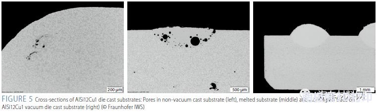 從圖5(左)中可以看出,常規(guī)生產(chǎn)的鋁壓鑄部件會有一些不規(guī)則分布的孔。當(dāng)激光熔化孔周圍的材料時,將造成孔的膨脹,導(dǎo)致起泡,如圖5(中)。而真空鑄造工藝可有效改善孔隙問題,防止起泡,如圖5(右)。