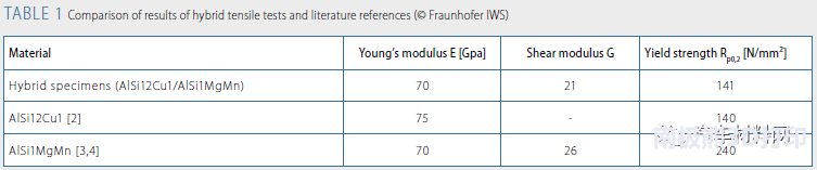 下表1展示了混合部件和單一材料的機(jī)械性能對比,雖然性能略低于單一材料的文獻(xiàn)參考值,但均符合汽車工業(yè)的要求。且在測試中,相關(guān)的連接區(qū)域沒有發(fā)生失效。