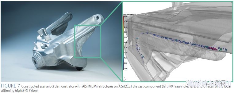基于該工藝,研究人員制造了一個發(fā)動機(jī)支撐結(jié)構(gòu),如圖7(左)。由于奧迪這款產(chǎn)品已停產(chǎn),所以未能進(jìn)行真空鑄造。從圖7右側(cè)的CT掃描中可以看出,通過LPD生產(chǎn)的加強(qiáng)肋幾乎沒有孔隙。其僅在壓鑄和附加結(jié)構(gòu)之間的過渡區(qū)域中出現(xiàn)部分孔隙。目前該團(tuán)隊(duì)正在研究制造用于動態(tài)/靜態(tài)力學(xué)性能以及耐腐蝕性測試的部件。
