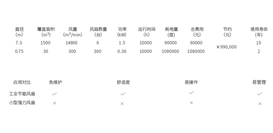 (稀釋煙霧和異味濃度) 經濟節能 開勒扇擁有15年的超長壽命,超級節能,投資回報收益明顯。 與小風扇對比 與傳統掛壁式工業風扇對比,一臺直徑7.3米的開勒扇覆蓋面積約等于50臺0.75米傳統小風扇的覆蓋面積。以10000平米廠房達到全覆蓋為例,需要小型風扇300臺,而使用開勒扇只需要10臺。按每年使用8個月,每天10小時計算,開勒扇節能達92%。